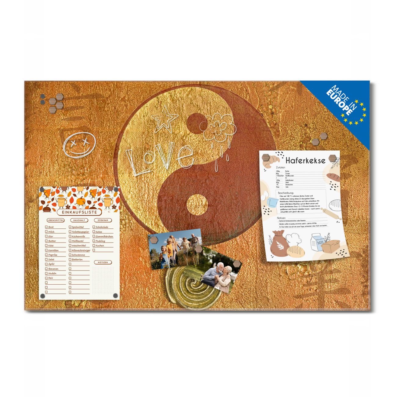 Material: 4mm Sicherheitsglas mit Metallrückwand Eigenschaften: beschreibbar, magnetisch, kratzfest Maße: 75x50x0,6cm, 5,63kg schwer Motiv Nummer 12054 Yin Yang Zubehör: inklusive 4 Neodym-Magnete