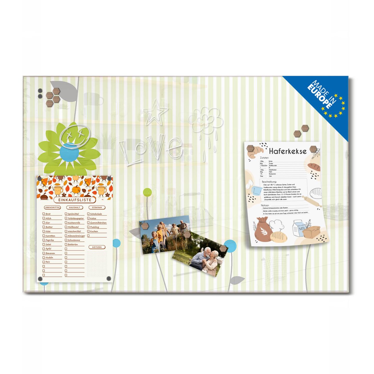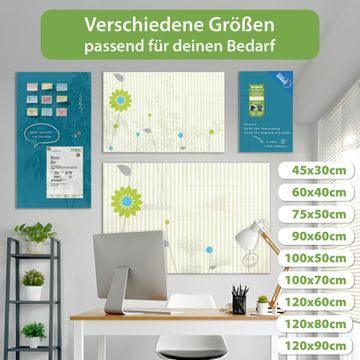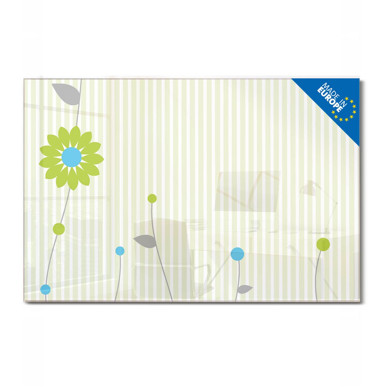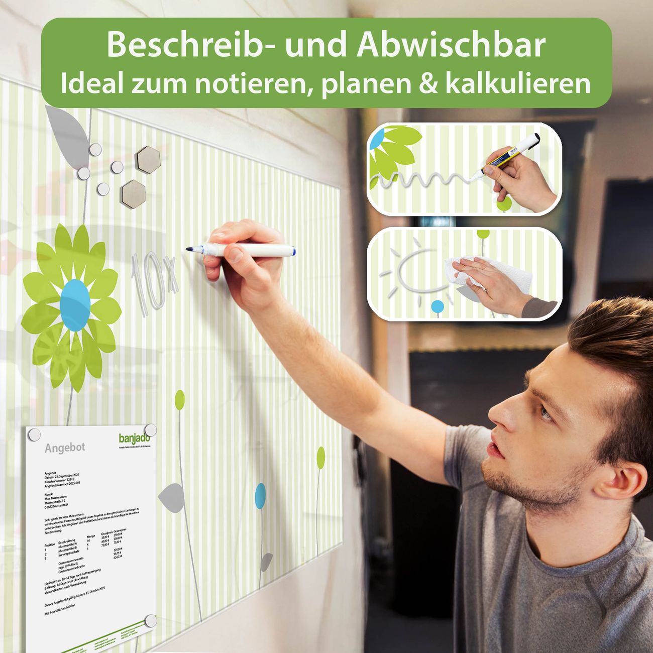 Material: 4mm Sicherheitsglas mit Metallrückwand Eigenschaften: beschreibbar, magnetisch, kratzfest Maße: 100x50x0,6cm, 7,50kg schwer Motiv Nummer 10906 Zarte Blumen Zubehör: inklusive 4 Neodym-Magnete