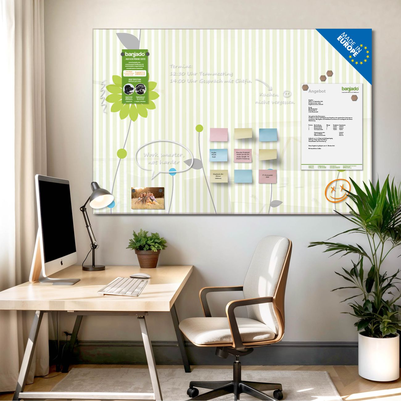 Die banjado Glas Magnettafel im Querformat mit Motiv Motiv Zarte Blumen bringt Ordnung in Ihr Zettelchaos. Fotos, Termine, Notizen oder Rezepte lassen Sich hier stilvoll mit Magneten ordnen, so behalten Sie alles Wichtige im Blick. Das Memoboard aus Glas ist beschreibbar und wird Ihnen bereits mit 4 Neodym-Magneten geliefert. Das Format bietet Ihnen ausreichend Platz um alle wichtigen Informationen im Blick zu behalten.