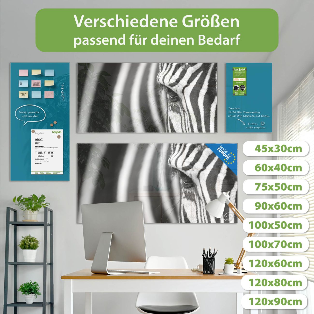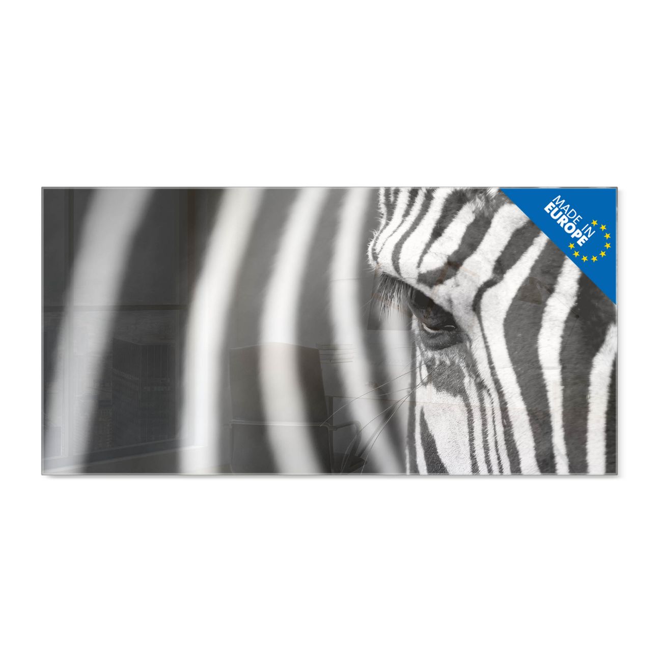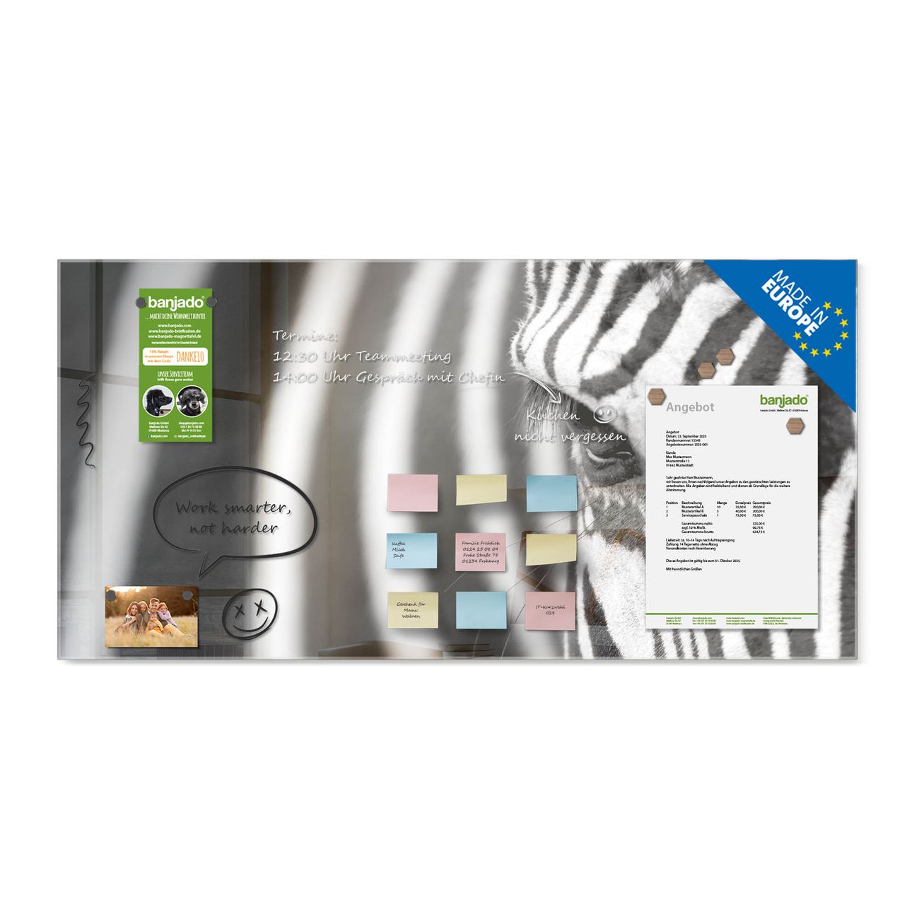 Material: 4mm Sicherheitsglas mit Metallrückwand Eigenschaften: beschreibbar, magnetisch, kratzfest Maße: 100x50x0,6cm, 7,50kg schwer Motiv Nummer 12386 Zebra En Face Zubehör: inklusive 4 Neodym-Magnete