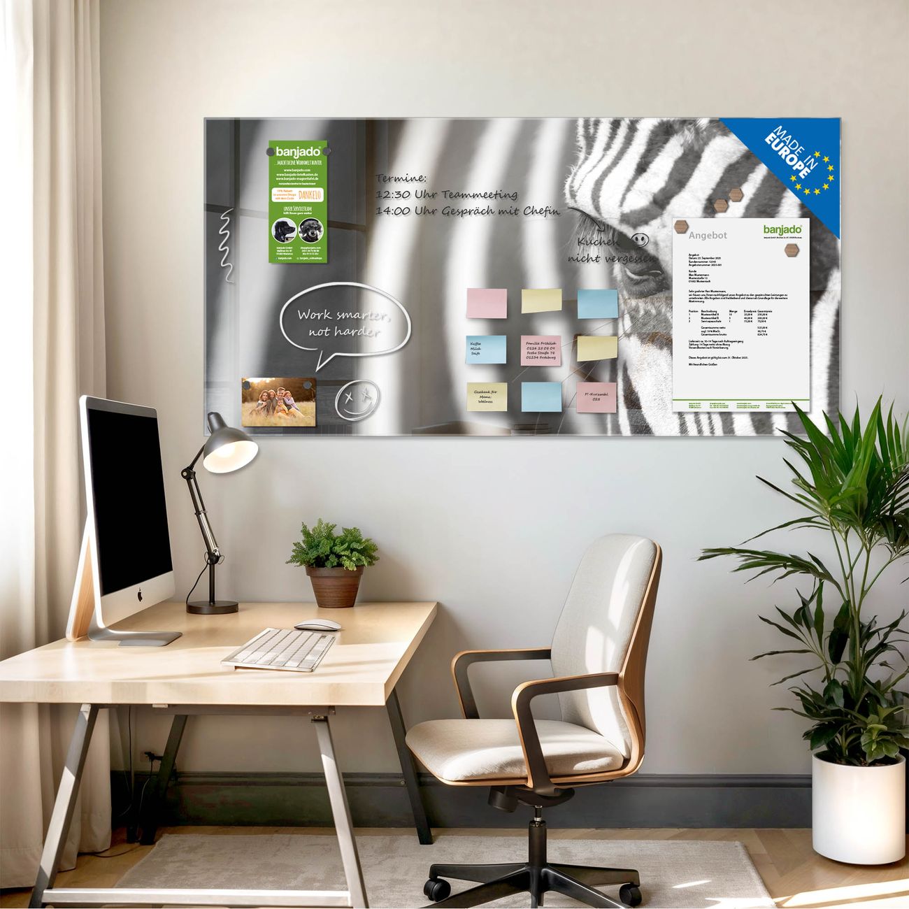 Die banjado Glas Magnettafel mit dem Motiv Motiv Zebra En Face verbindet Funktionalität mit Stil. Sie ersetzt das Zettelchaos durch klare Strukturen und bringt dabei eine warme, natürliche Atmosphäre in Ihr Zuhause. Ob im Büro, in der Küche oder im Eingangsbereich - dieses Design-Board zieht Blicke an und sorgt für Ordnung mit Charakter.