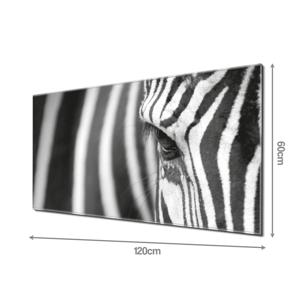Material: 4mm Sicherheitsglas mit Metallrückwand Eigenschaften: beschreibbar, magnetisch, kratzfest Maße: 120x60x0,6cm, 10,80kg schwer Motiv Nummer 12386 Zebra En Face Zubehör: inklusive 4 Neodym-Magnete