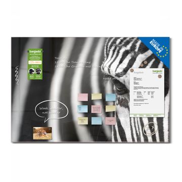 Material: 4mm Sicherheitsglas mit Metallrückwand Eigenschaften: beschreibbar, magnetisch, kratzfest Maße: 120x80x0,6cm, 14,40kg schwer Motiv Nummer 12386 Zebra En Face Zubehör: inklusive 4 Neodym-Magnete