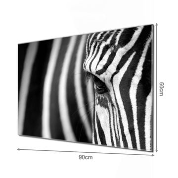Material: 4mm Sicherheitsglas mit Metallrückwand Eigenschaften: beschreibbar, magnetisch, kratzfest Maße: 90x60x0,6cm, 8,10kg schwer Motiv Nummer 12386 Zebra En Face Zubehör: inklusive 4 Neodym-Magnete
