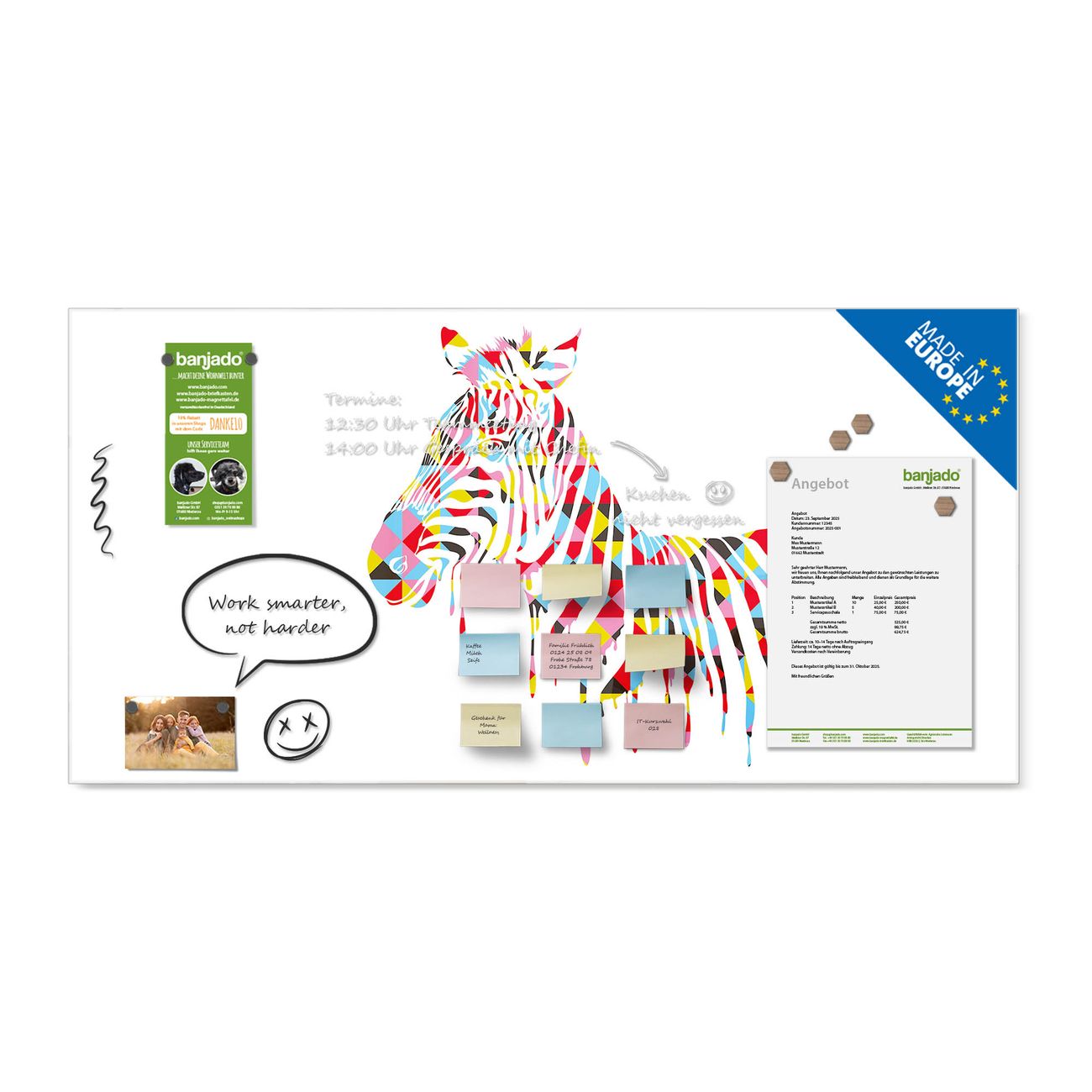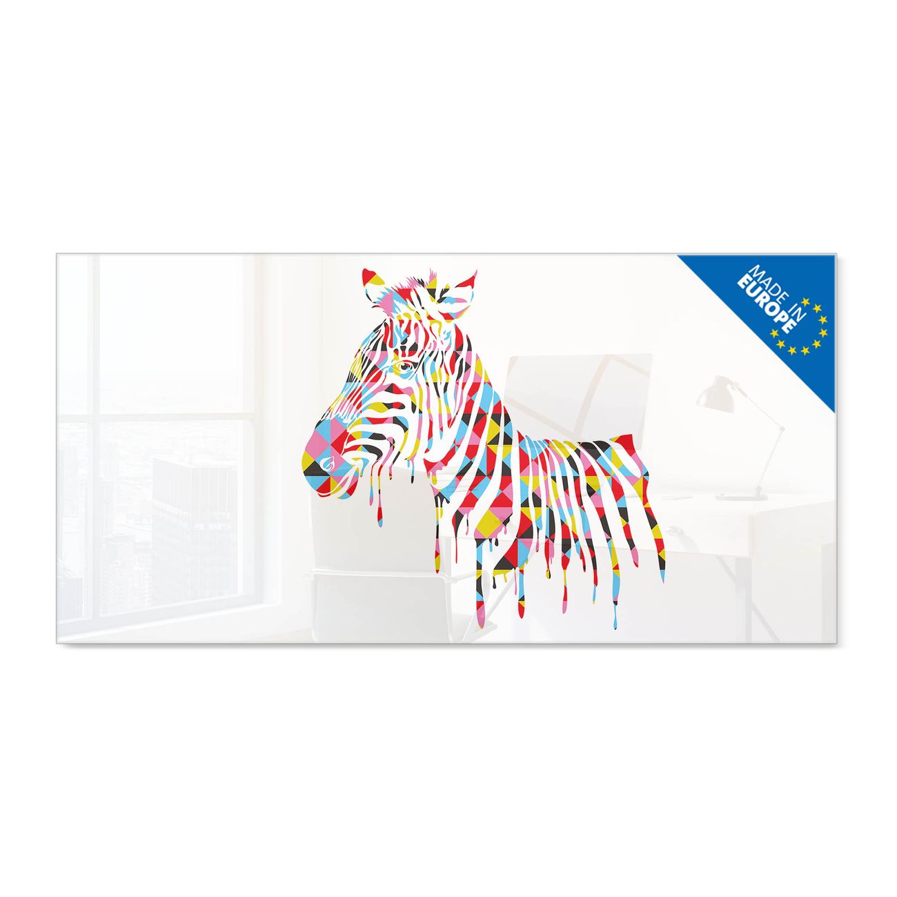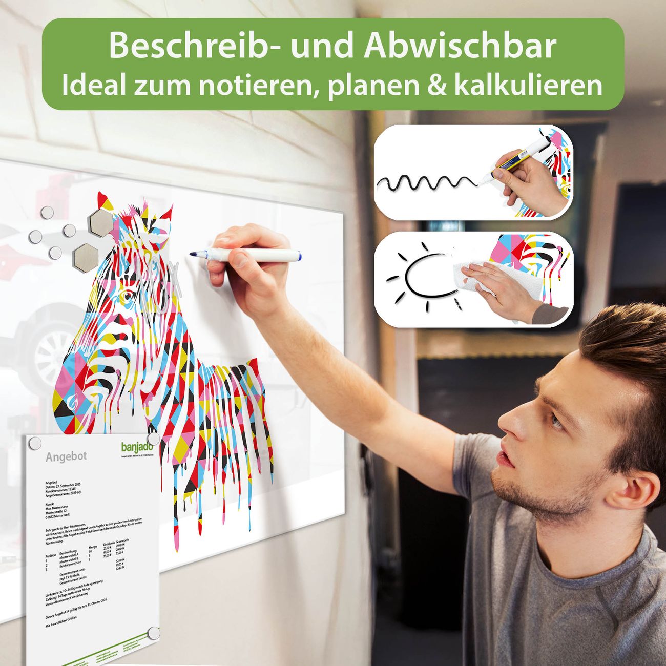 Material: 4mm Sicherheitsglas mit Metallrückwand Eigenschaften: beschreibbar, magnetisch, kratzfest Maße: 100x50x0,6cm, 7,50kg schwer Motiv Nummer 12119 Zebra Zubehör: inklusive 4 Neodym-Magnete