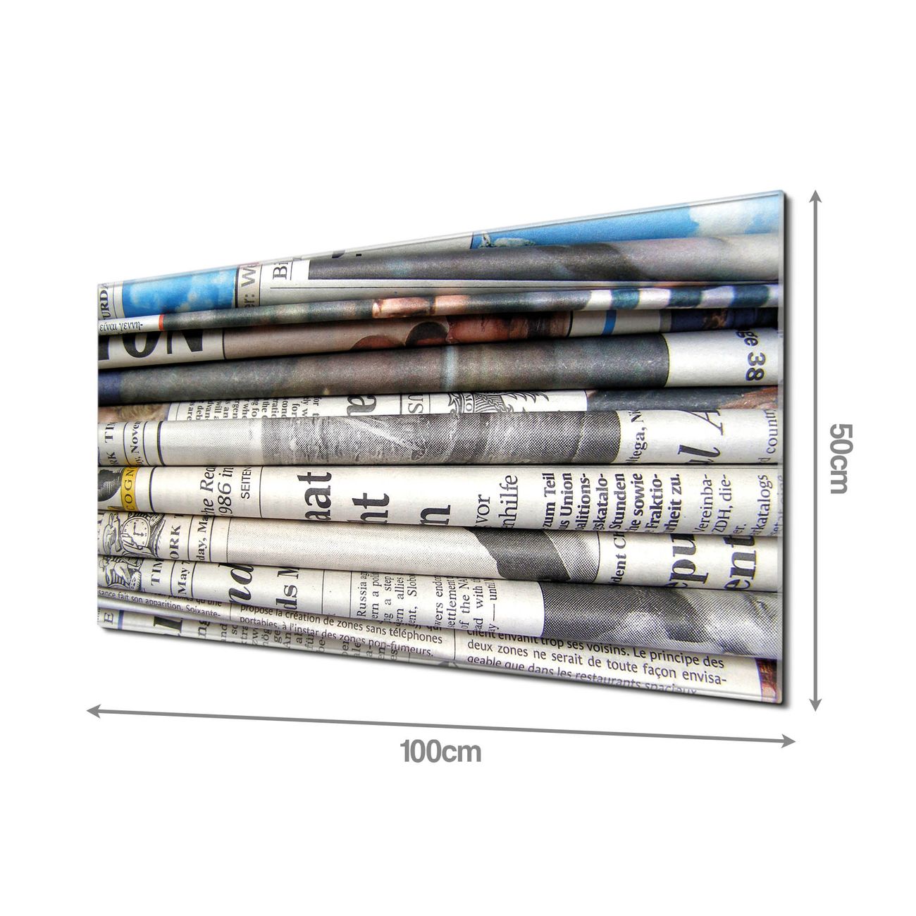 Material: 4mm Sicherheitsglas mit Metallrückwand Eigenschaften: beschreibbar, magnetisch, kratzfest Maße: 100x50x0,6cm, 7,50kg schwer Motiv Nummer 10039 Zeitungen Zubehör: inklusive 4 Neodym-Magnete