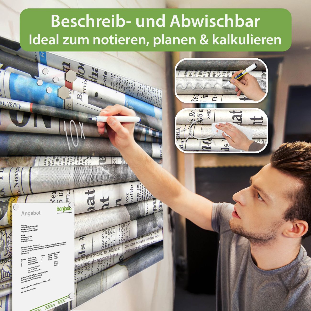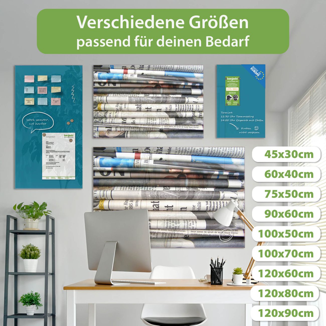 Material: 4mm Sicherheitsglas mit Metallrückwand Eigenschaften: beschreibbar, magnetisch, kratzfest Maße: 75x50x0,6cm, 5,63kg schwer Motiv Nummer 10039 Zeitungen Zubehör: inklusive 4 Neodym-Magnete