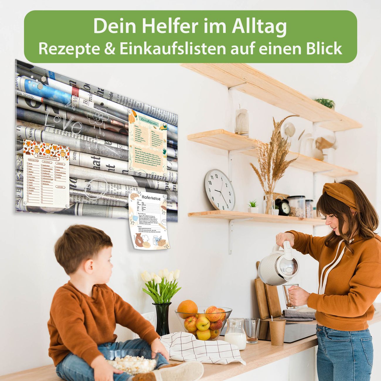 Ein Stück Design, das Ihren Alltag organisiert. Schreiben, heften, inspirieren - alles an einem Ort. Qualität, die man spürt. Montage leicht gemacht. Handwerk mit Herz - veredelt in Sachsen. Einzigartiges Design mit Motiv Motiv Zeitungen Beschreibbare Glasoberfläche, leicht zu reinigen Starke Magnetkraft durch Stahlrückwand Inklusive 4 Neodym-Magneten Flexible Montageoptionen Handveredelt in Sachsen - Qualität, die bleibt