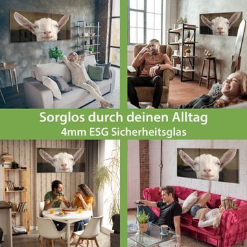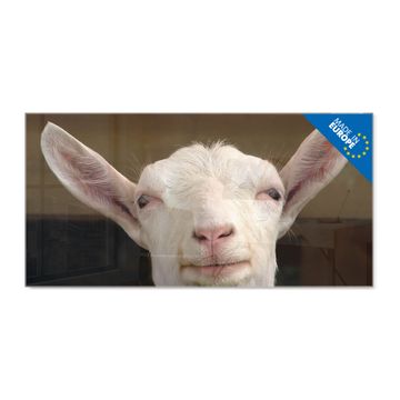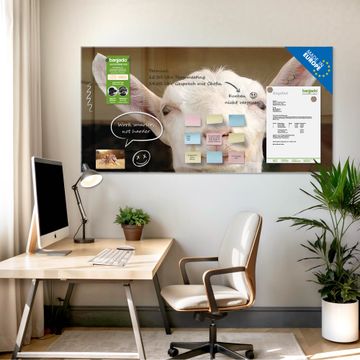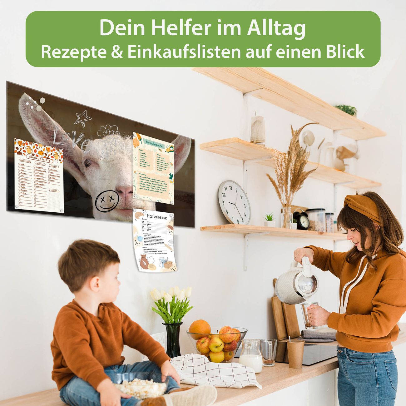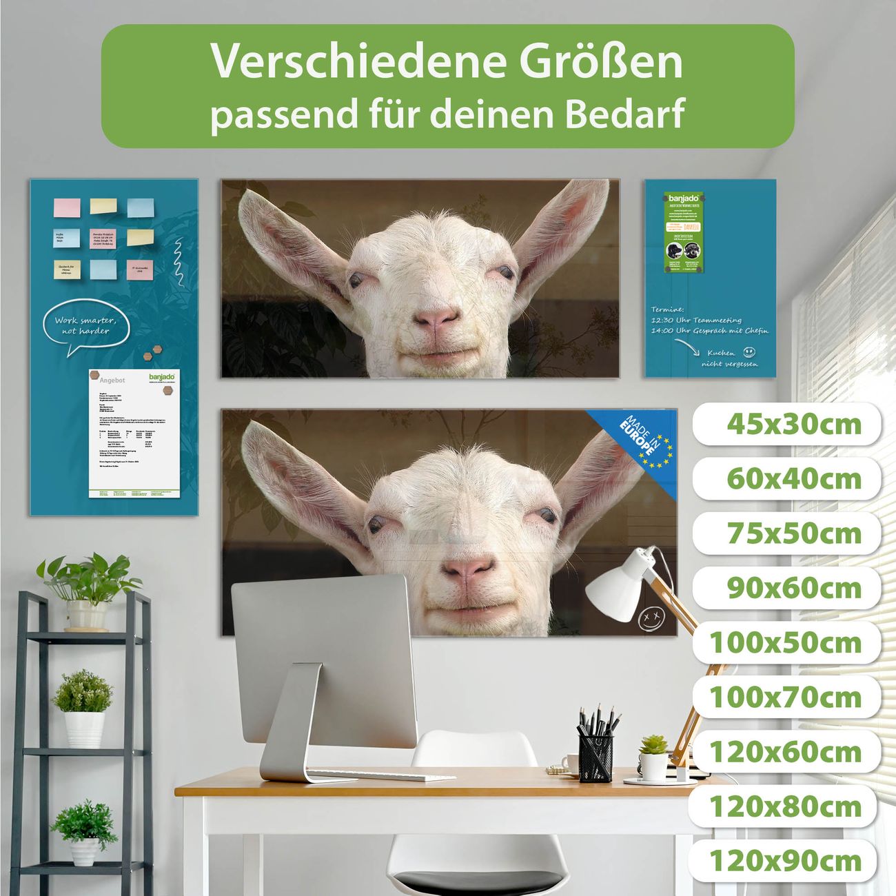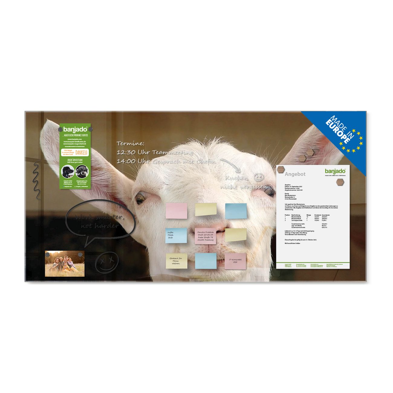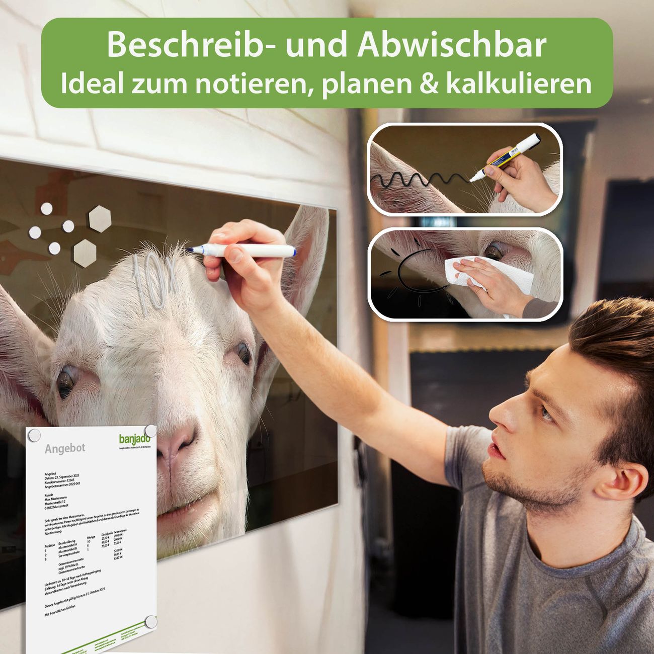 Material: 4mm Sicherheitsglas mit Metallrückwand Eigenschaften: beschreibbar, magnetisch, kratzfest Maße: 100x50x0,6cm, 7,50kg schwer Motiv Nummer 10190 Ziege Zubehör: inklusive 4 Neodym-Magnete