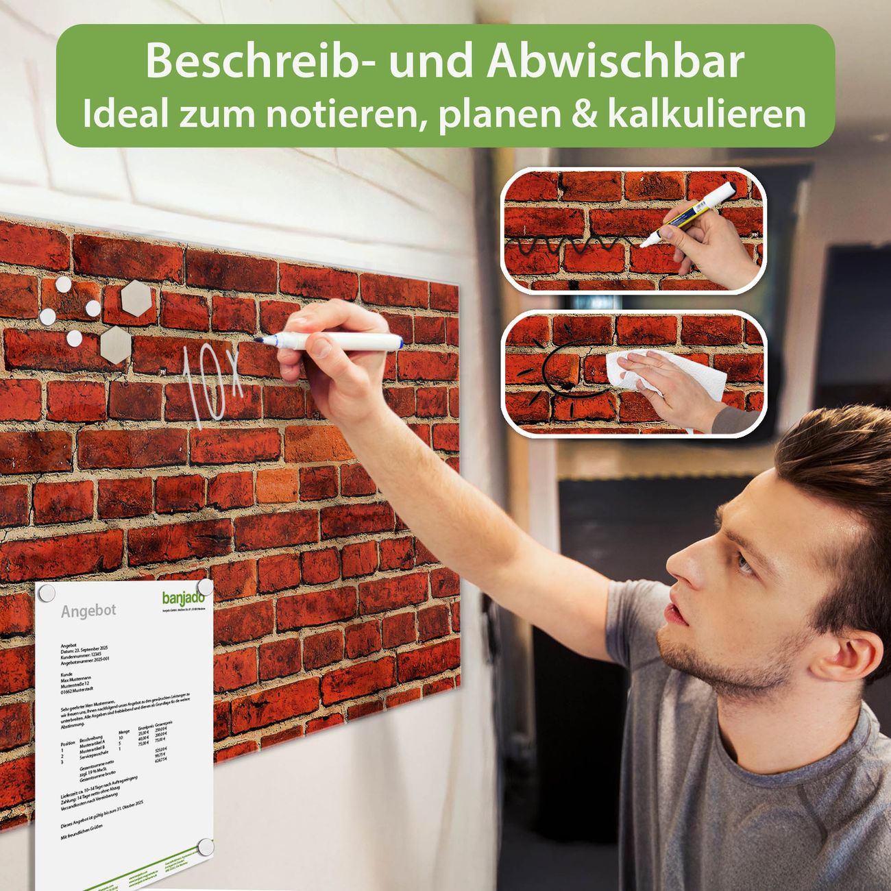 Jede Glas Magnettafel wird in unserer Werkstatt von Hand gefertigt und sorgfältig geprüft. So erhalten Sie ein echtes Qualitätsprodukt, das Funktion und Ästhetik perfekt vereint.?? Warum banjado?