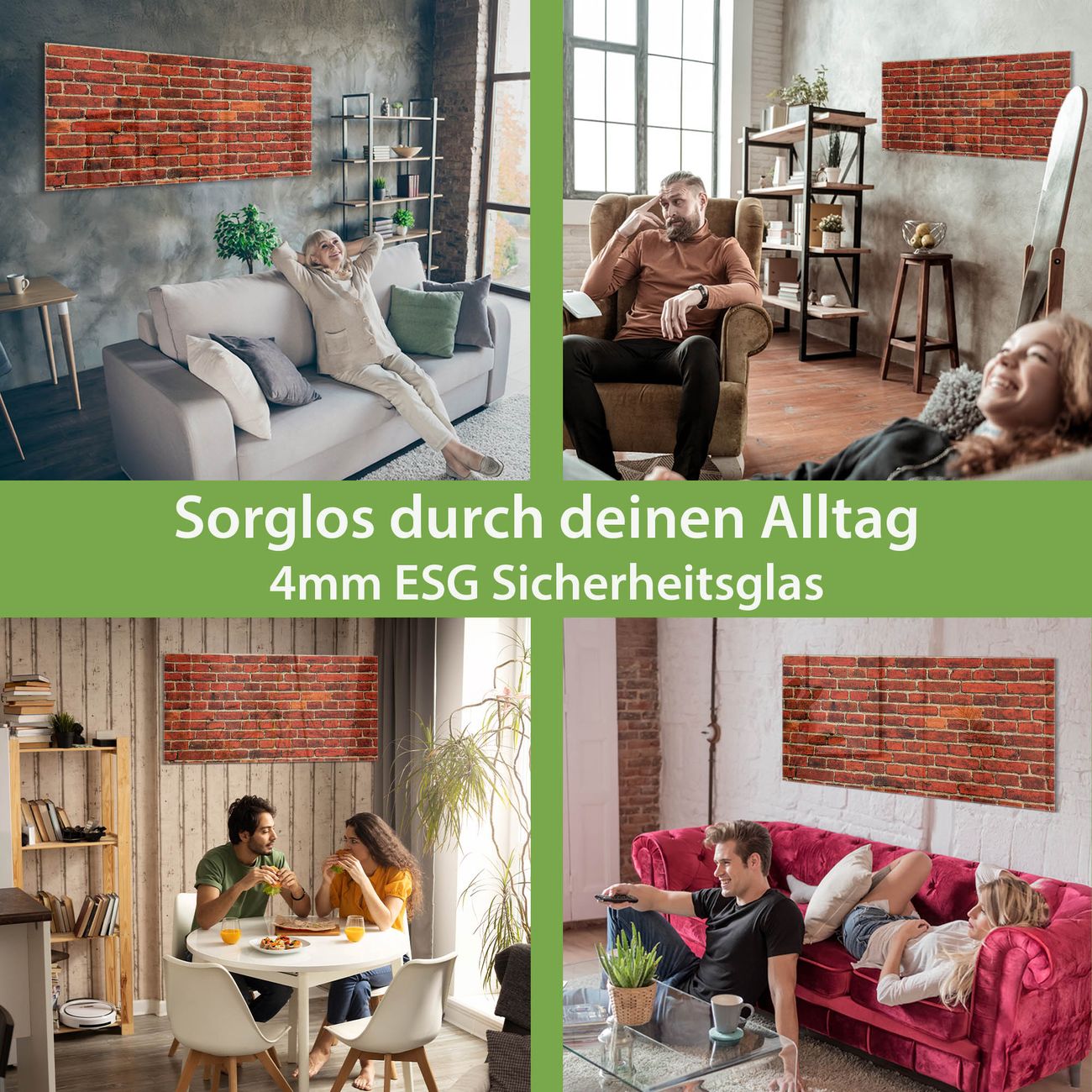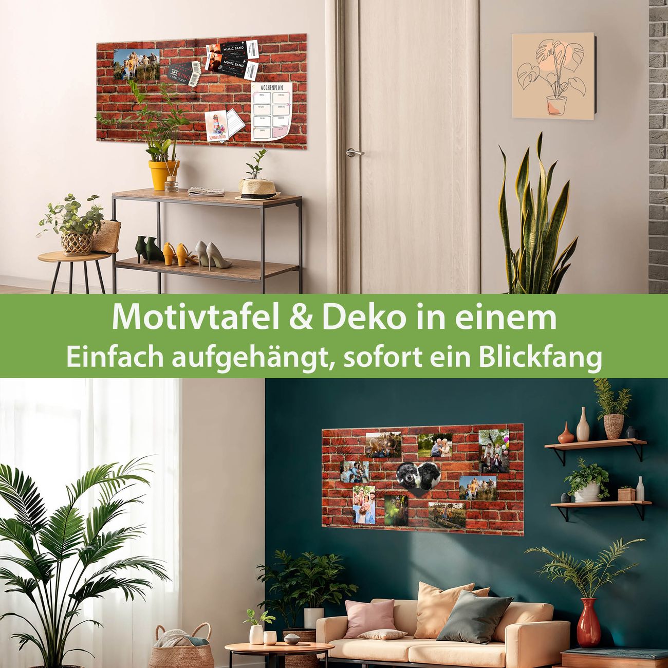 Material: 4mm Sicherheitsglas mit Metallrückwand Eigenschaften: beschreibbar, magnetisch, kratzfest Maße: 100x50x0,6cm, 7,50kg schwer Motiv Nummer 10099 Ziegelwand Zubehör: inklusive 4 Neodym-Magnete