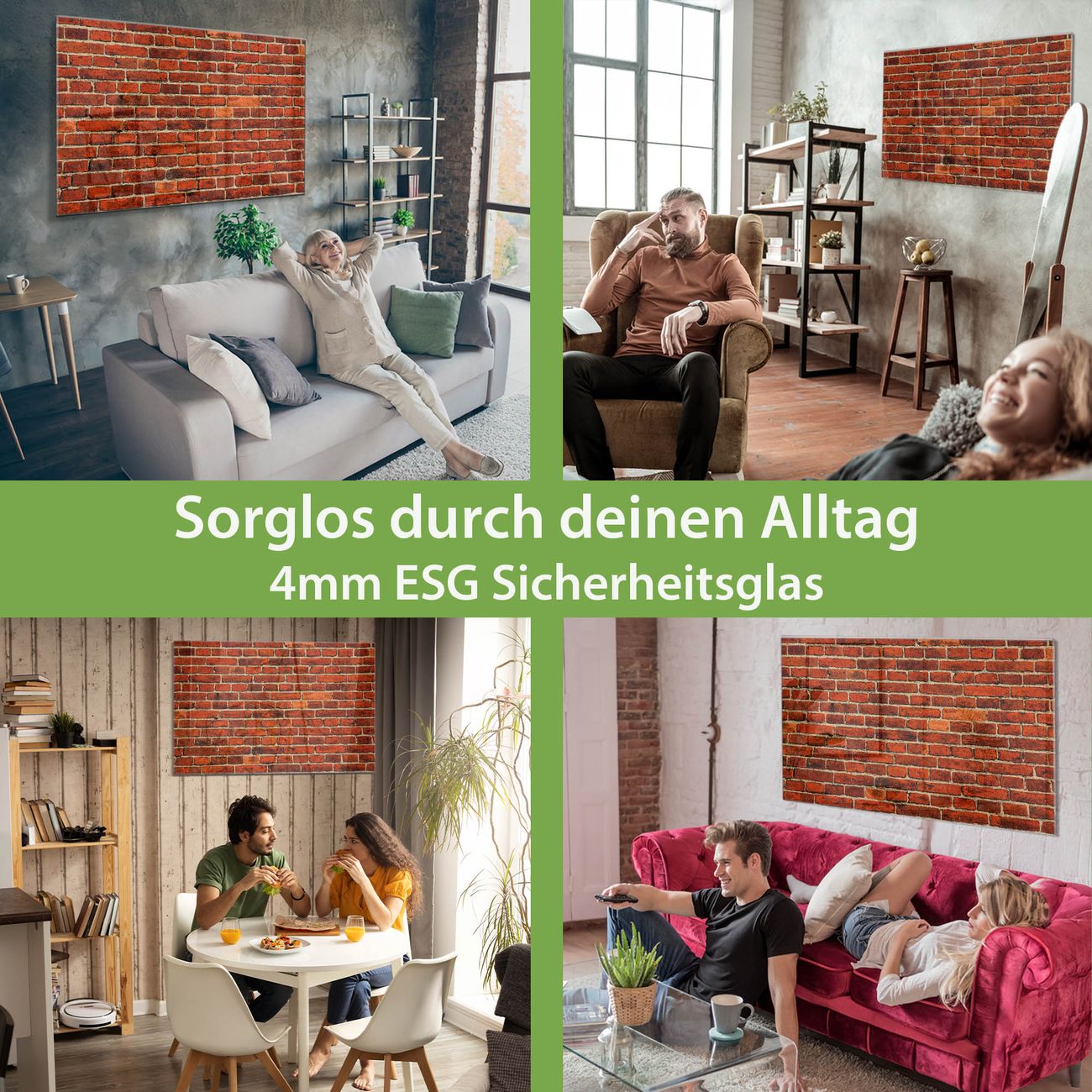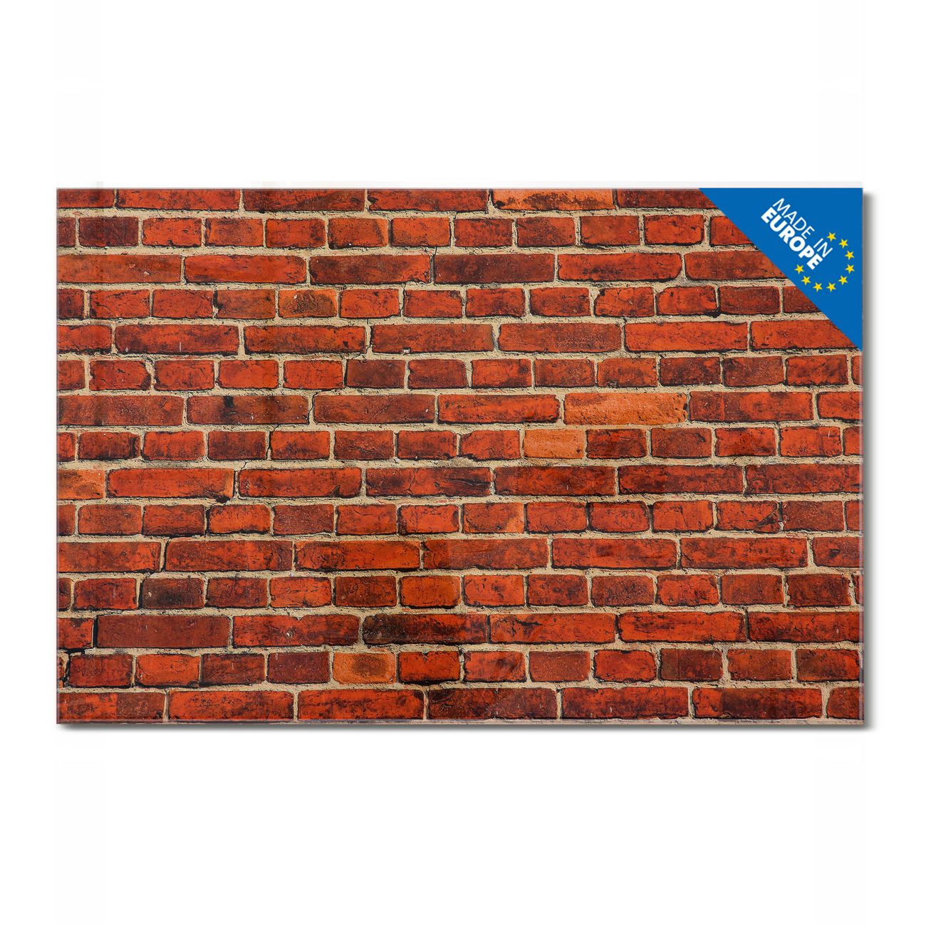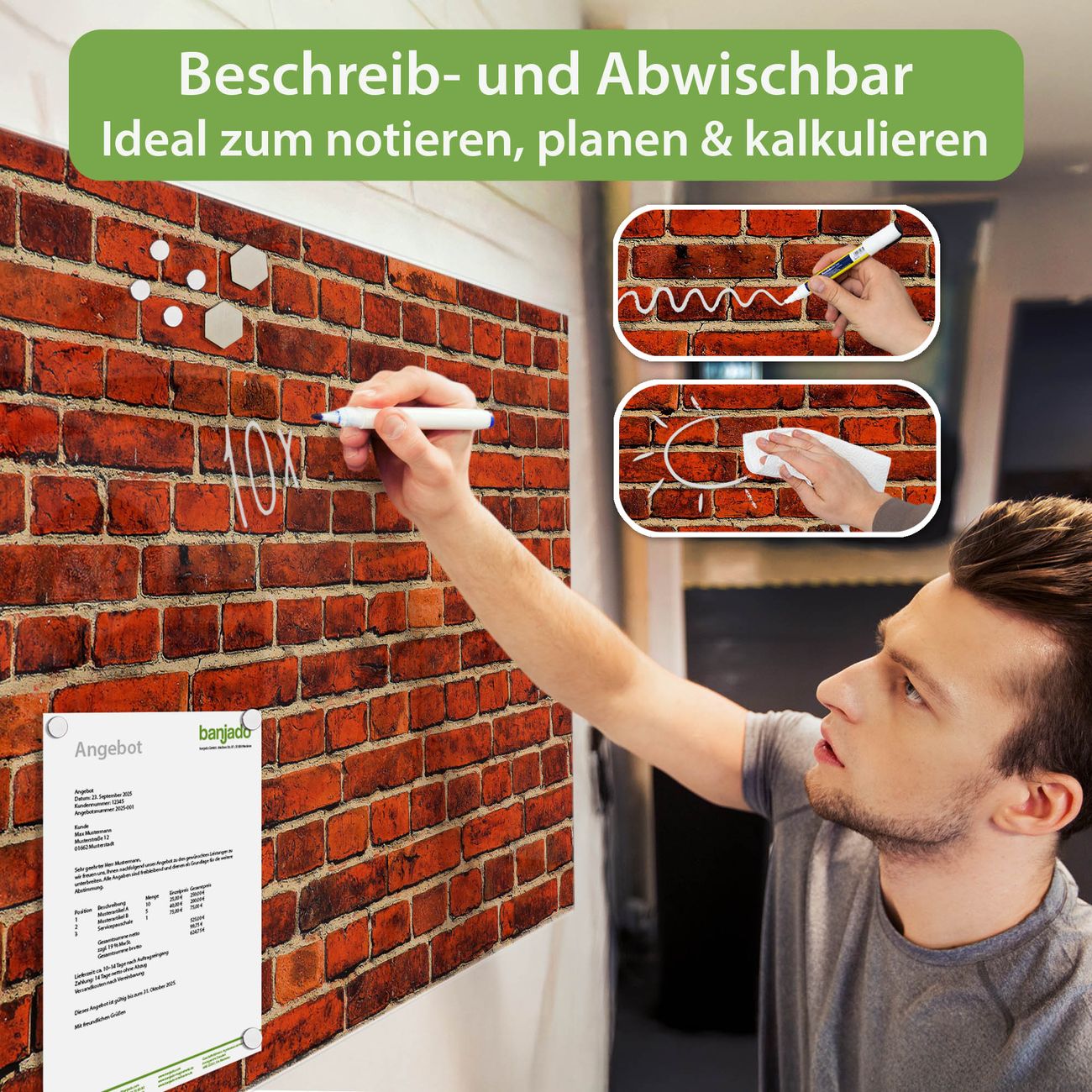 Material: 4mm Sicherheitsglas mit Metallrückwand Eigenschaften: beschreibbar, magnetisch, kratzfest Maße: 120x80x0,6cm, 14,40kg schwer Motiv Nummer 10099 Ziegelwand Zubehör: inklusive 4 Neodym-Magnete