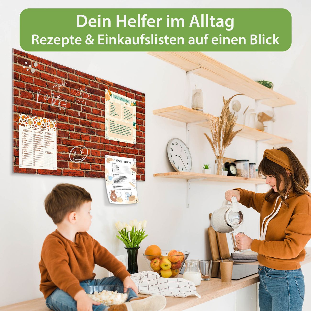 Ein Stück Design, das Ihren Alltag organisiert. Schreiben, heften, inspirieren - alles an einem Ort. Qualität, die man spürt. Montage leicht gemacht. Handwerk mit Herz - veredelt in Sachsen. Einzigartiges Design mit Motiv Motiv Ziegelwand Beschreibbare Glasoberfläche, leicht zu reinigen Starke Magnetkraft durch Stahlrückwand Inklusive 4 Neodym-Magneten Flexible Montageoptionen Handveredelt in Sachsen - Qualität, die bleibt