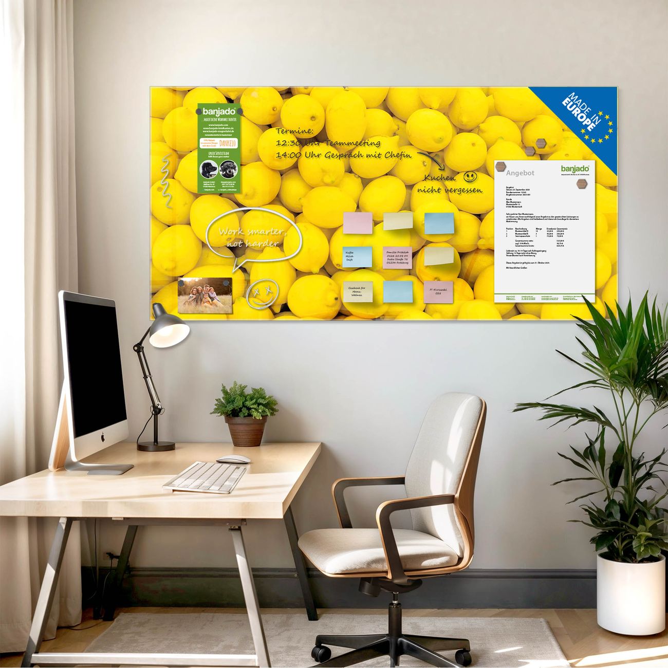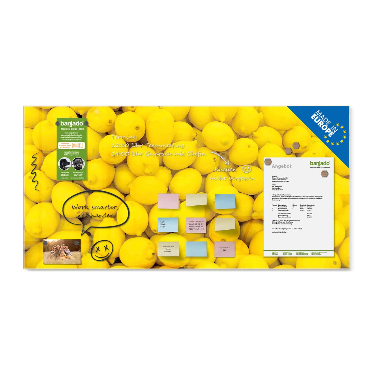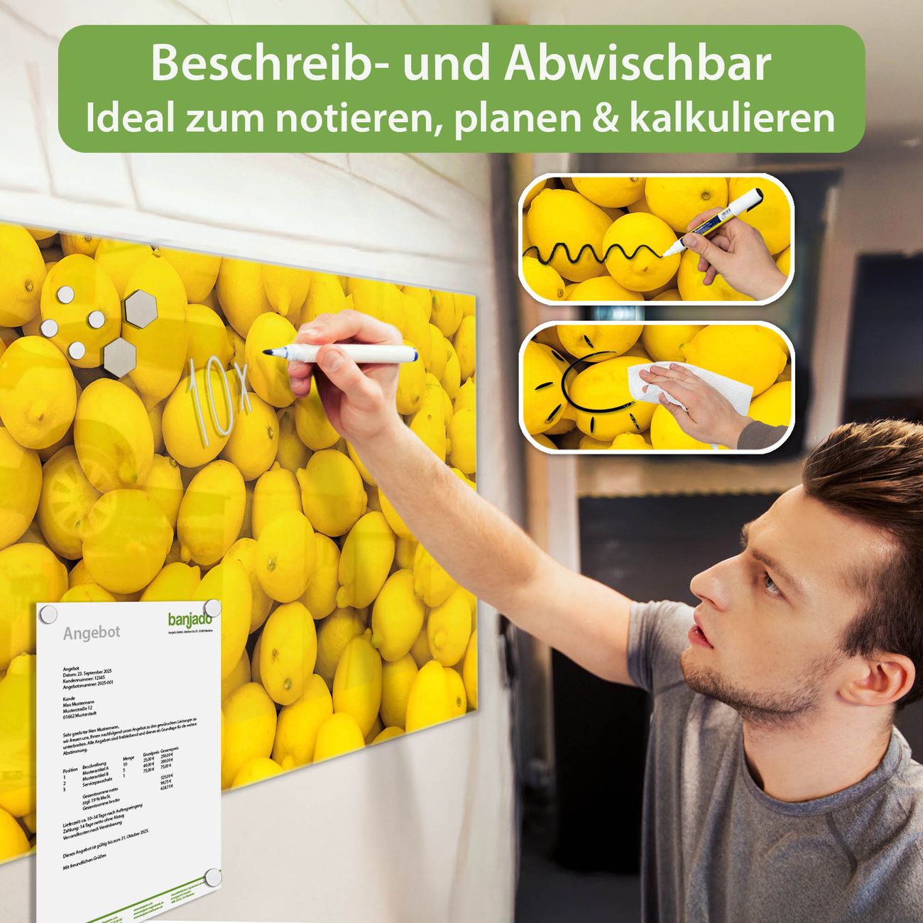 Material: 4mm Sicherheitsglas mit Metallrückwand Eigenschaften: beschreibbar, magnetisch, kratzfest Maße: 100x50x0,6cm, 7,50kg schwer Motiv Nummer 11662 Zitronen Zubehör: inklusive 4 Neodym-Magnete