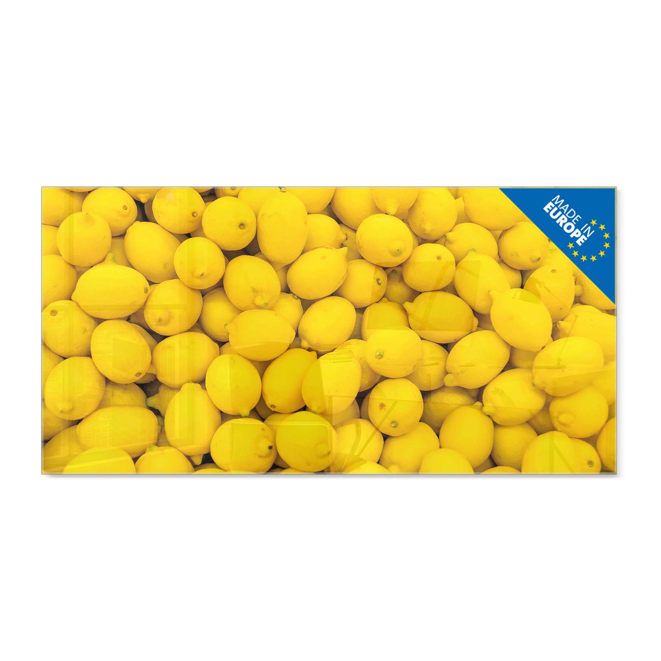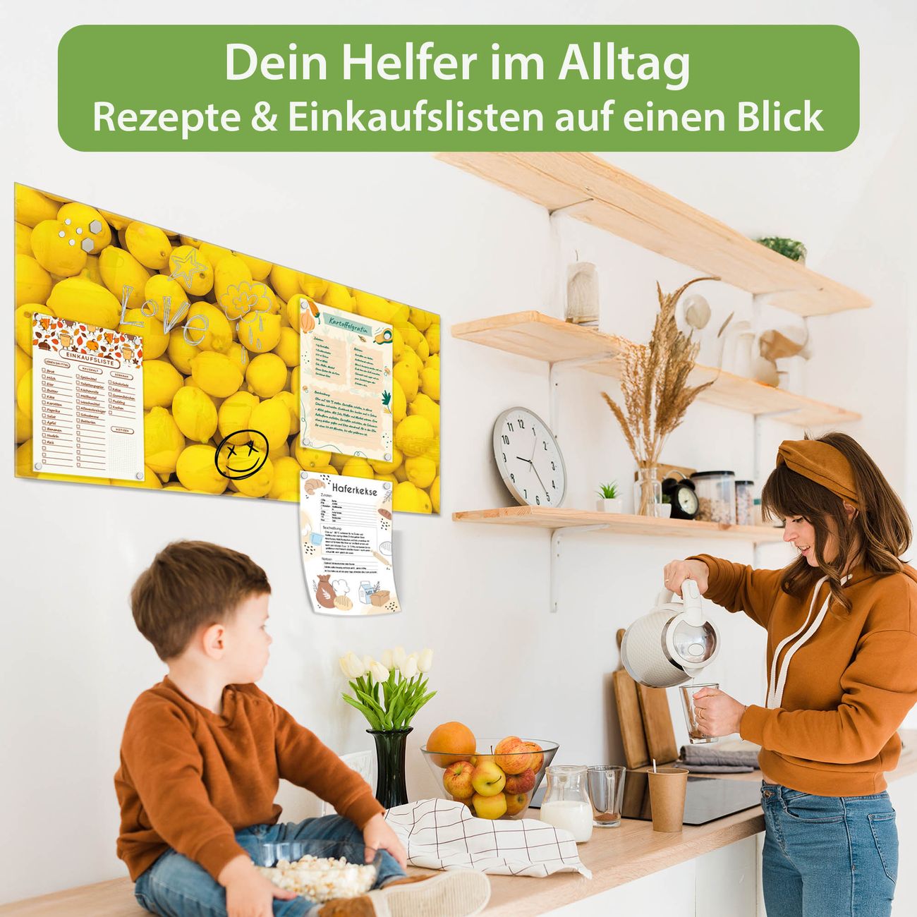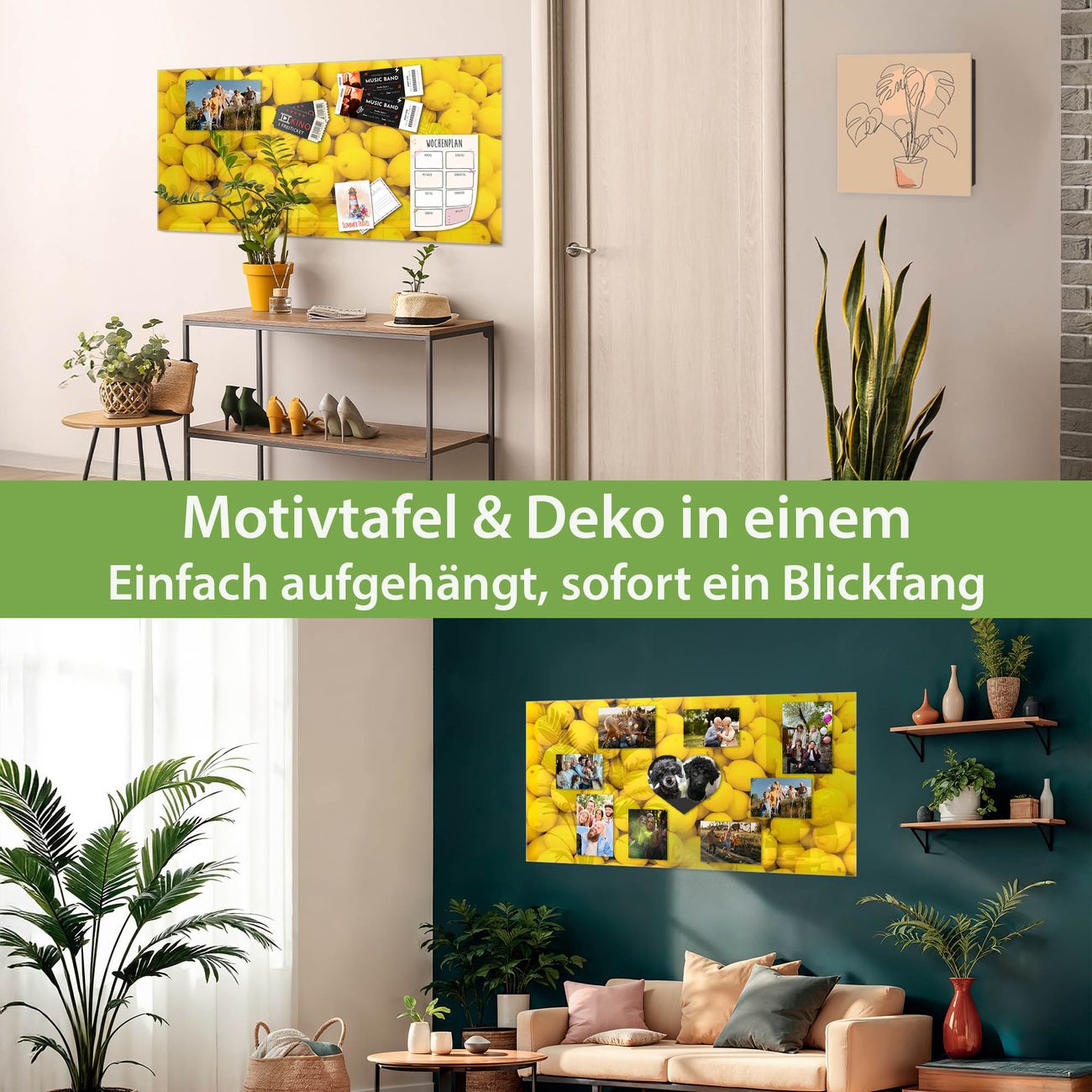 Material: 4mm Sicherheitsglas mit Metallrückwand Eigenschaften: beschreibbar, magnetisch, kratzfest Maße: 100x50x0,6cm, 7,50kg schwer Motiv Nummer 11662 Zitronen Zubehör: inklusive 4 Neodym-Magnete