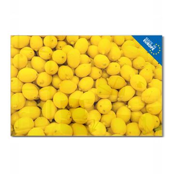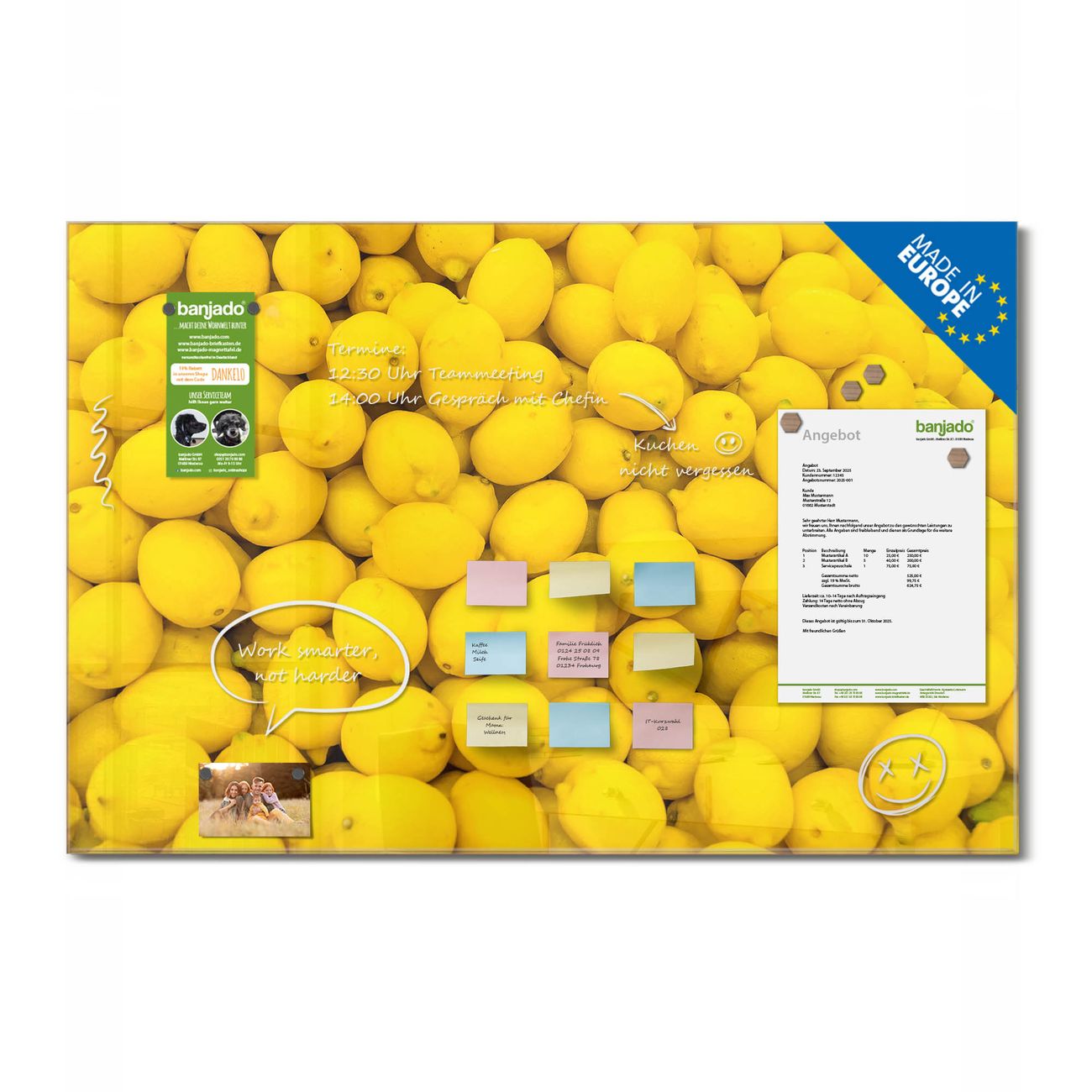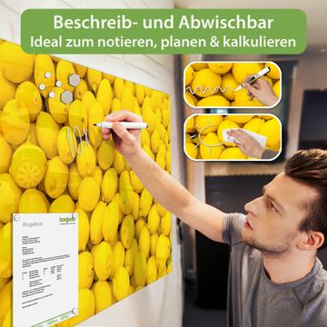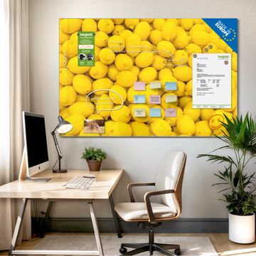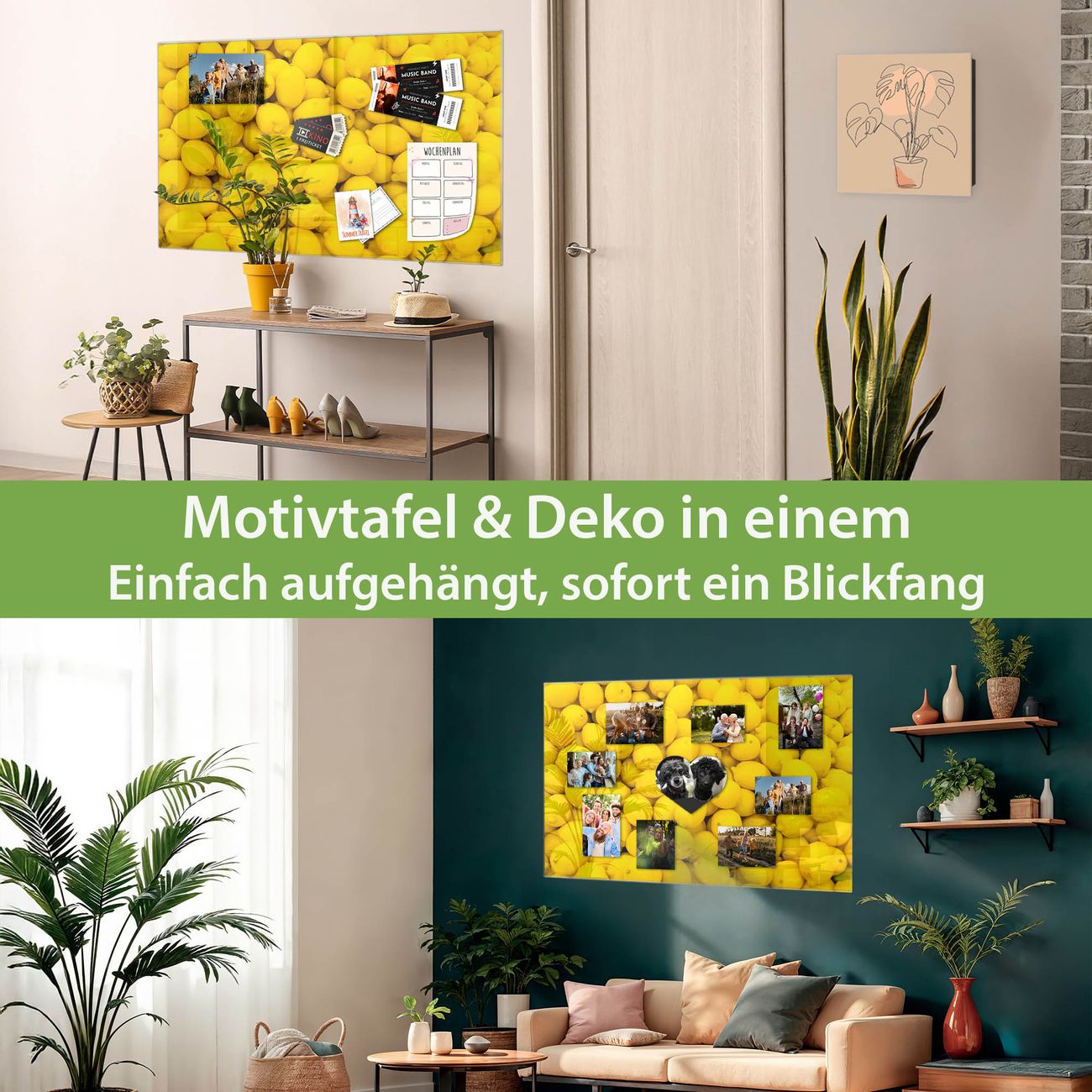 Material: 4mm Sicherheitsglas mit Metallrückwand Eigenschaften: beschreibbar, magnetisch, kratzfest Maße: 120x80x0,6cm, 14,40kg schwer Motiv Nummer 11662 Zitronen Zubehör: inklusive 4 Neodym-Magnete