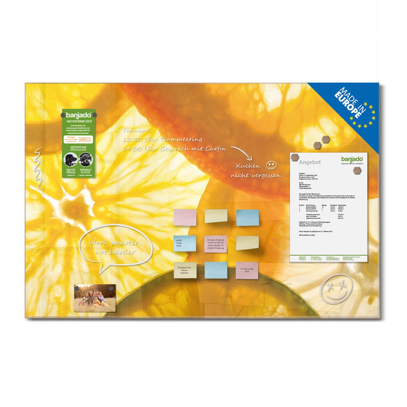 Material: 4mm Sicherheitsglas mit Metallrückwand Eigenschaften: beschreibbar, magnetisch, kratzfest Maße: 120x80x0,6cm, 14,40kg schwer Motiv Nummer 11688 Zitrusfrüchte Zubehör: inklusive 4 Neodym-Magnete