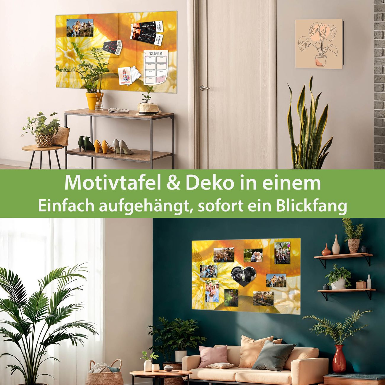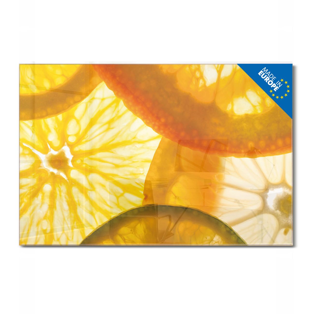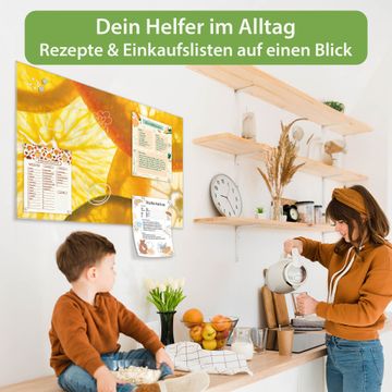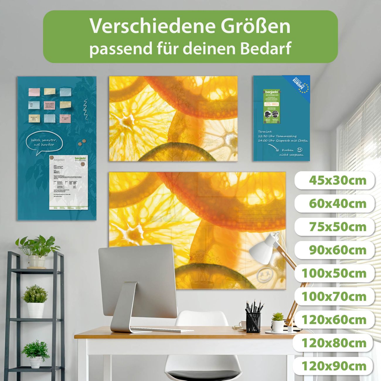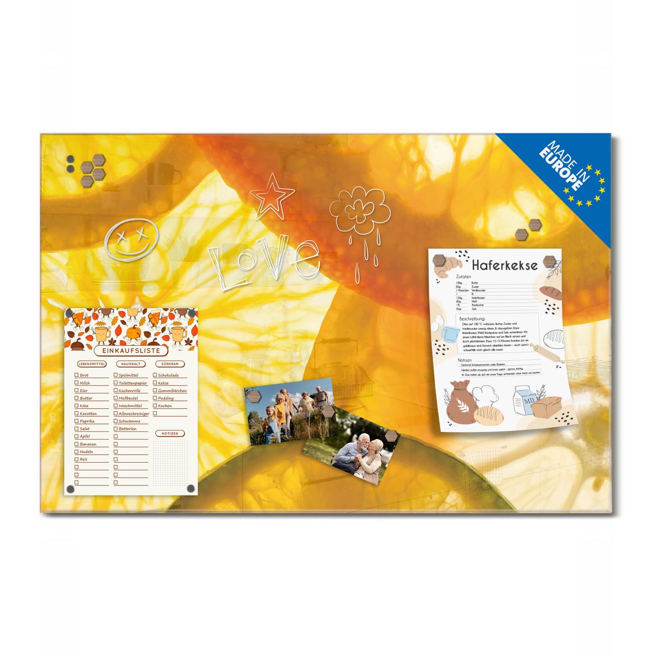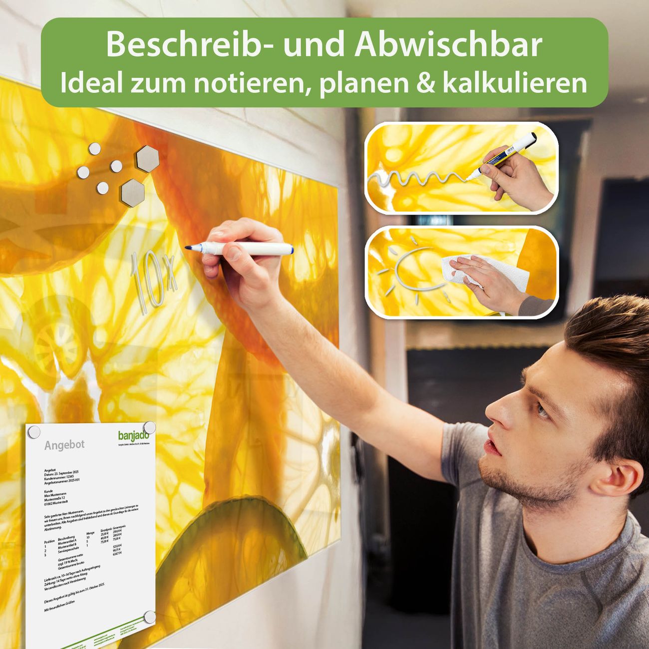 Material: 4mm Sicherheitsglas mit Metallrückwand Eigenschaften: beschreibbar, magnetisch, kratzfest Maße: 75x50x0,6cm, 5,63kg schwer Motiv Nummer 11688 Zitrusfrüchte Zubehör: inklusive 4 Neodym-Magnete