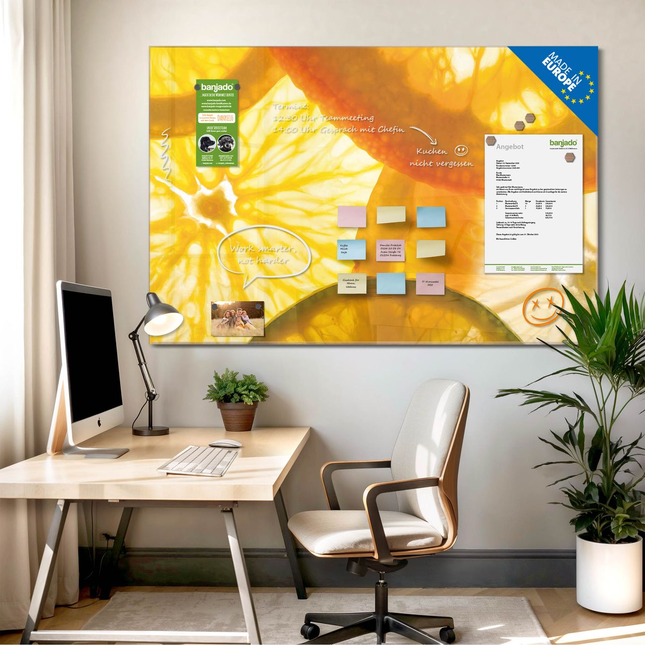Die banjado Glas Magnettafel mit dem Motiv Motiv Zitrusfrüchte verbindet Funktionalität mit Stil. Sie ersetzt das Zettelchaos durch klare Strukturen und bringt dabei eine warme, natürliche Atmosphäre in Ihr Zuhause. Ob im Büro, in der Küche oder im Eingangsbereich - dieses Design-Board zieht Blicke an und sorgt für Ordnung mit Charakter.