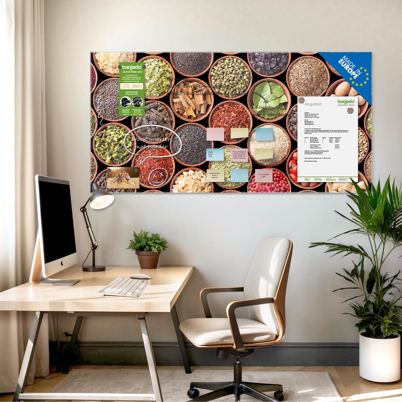 Die banjado Glas Magnettafel mit dem Motiv Motiv Zutaten verbindet Funktionalität mit Stil. Sie ersetzt das Zettelchaos durch klare Strukturen und bringt dabei eine warme, natürliche Atmosphäre in Ihr Zuhause. Ob im Büro, in der Küche oder im Eingangsbereich - dieses Design-Board zieht Blicke an und sorgt für Ordnung mit Charakter.