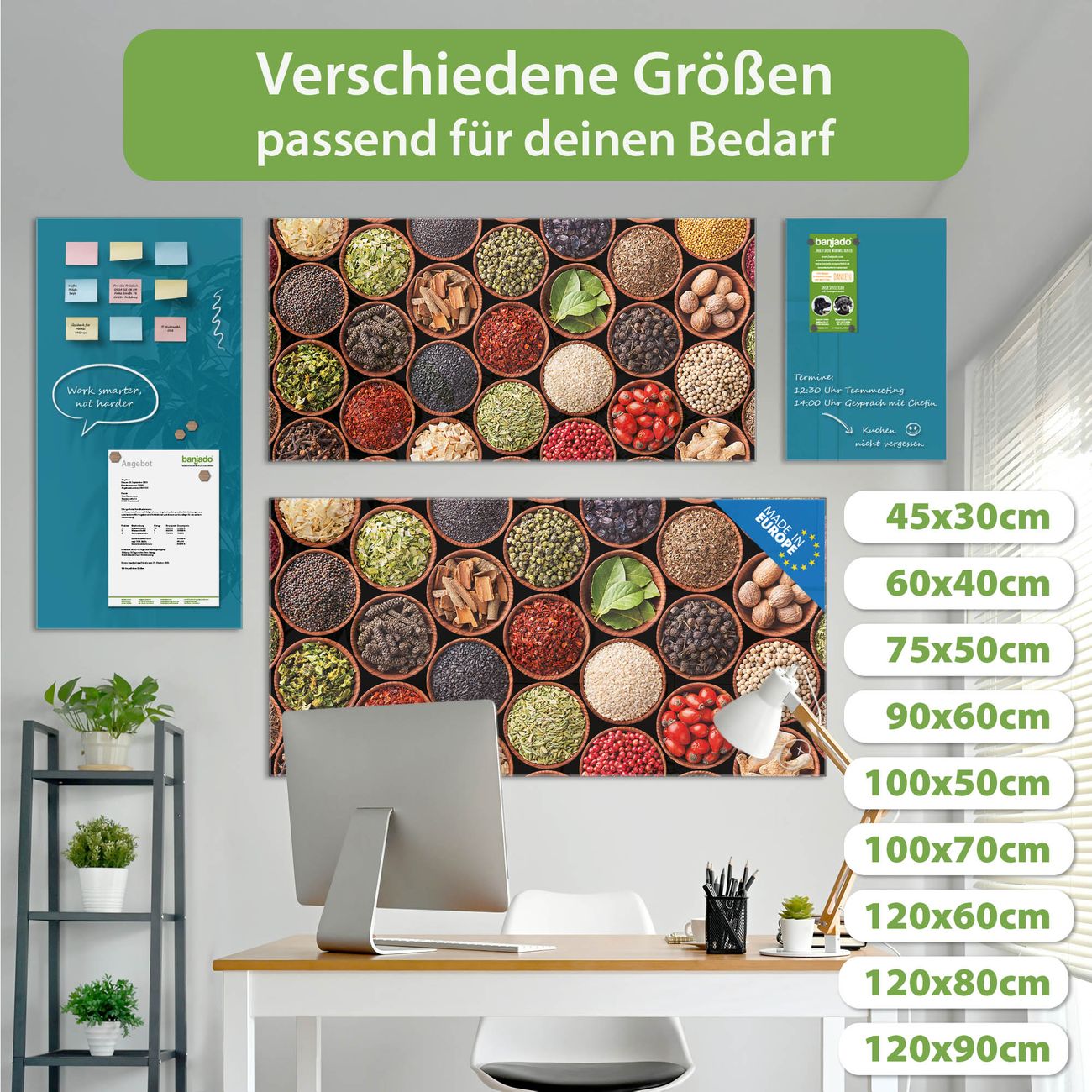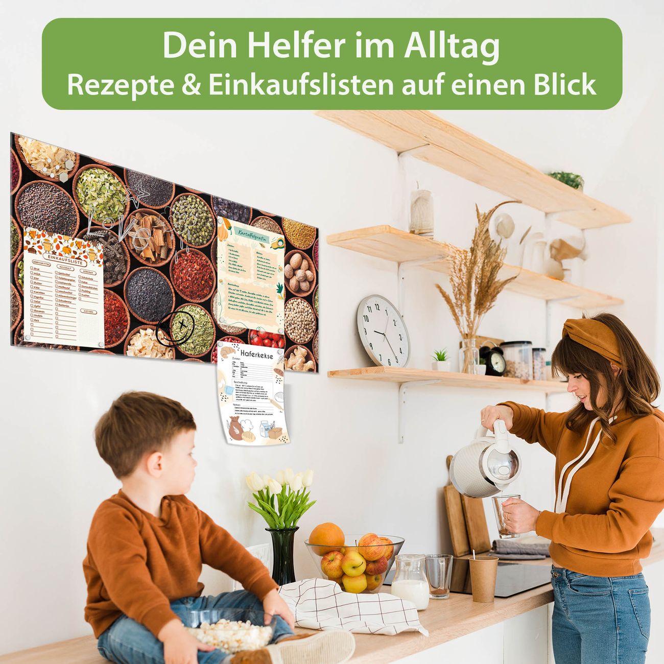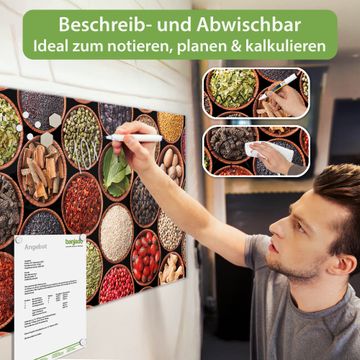 Material: 4mm Sicherheitsglas mit Metallrückwand Eigenschaften: beschreibbar, magnetisch, kratzfest Maße: 100x50x0,6cm, 7,50kg schwer Motiv Nummer 11740 Zutaten Zubehör: inklusive 4 Neodym-Magnete