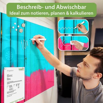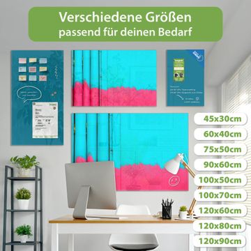 Material: 4mm Sicherheitsglas mit Metallrückwand Eigenschaften: beschreibbar, magnetisch, kratzfest Maße: 120x80x0,6cm, 14,40kg schwer Motiv Nummer 12663 Zwei Farben Zubehör: inklusive 4 Neodym-Magnete