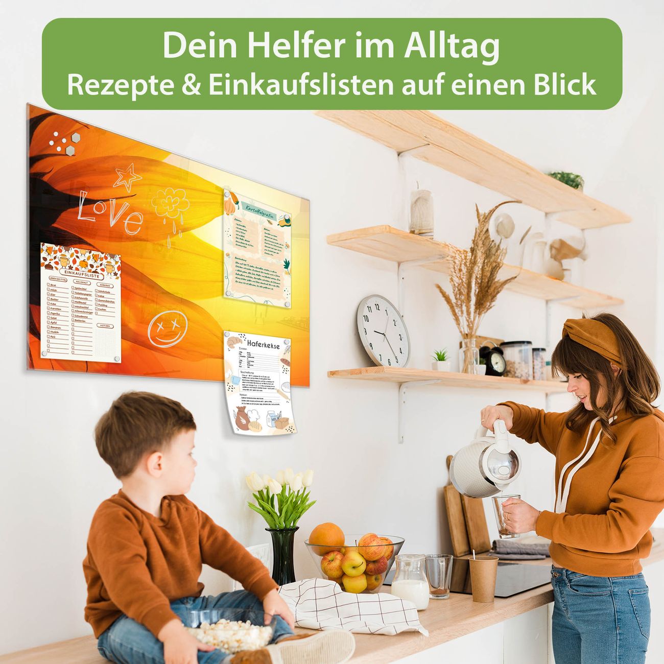 Auf der glatten Glasoberfläche lassen sich Termine, Rezepte oder Notizen ganz einfach mit Kreidestiften festhalten und rückstandslos entfernen. Starke Neodym-Magnete halten Ihre wichtigsten Erinnerungen sicher an Ort und Stelle. So entsteht Ihre ganz persönliche Ideenwand - jeden Tag neu.