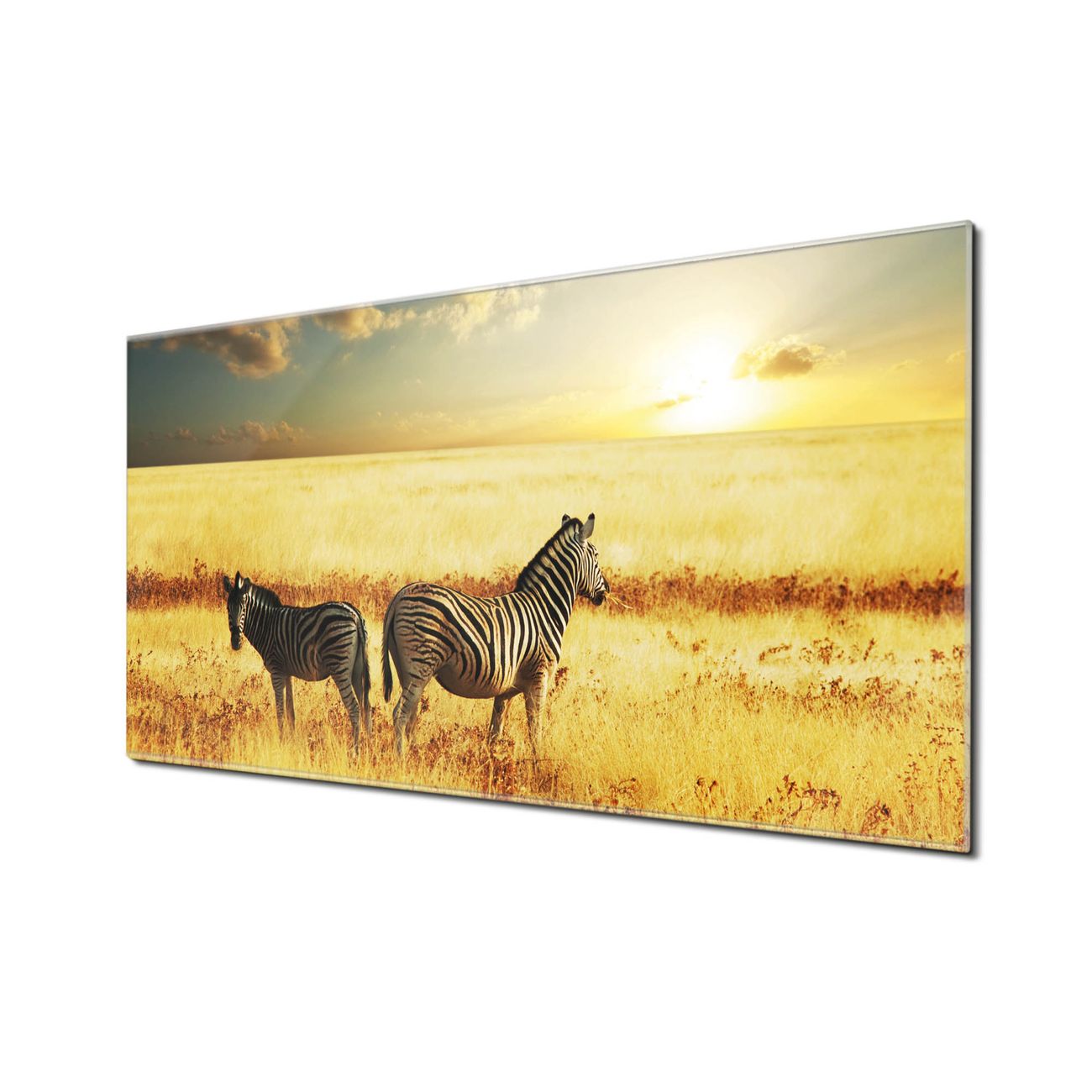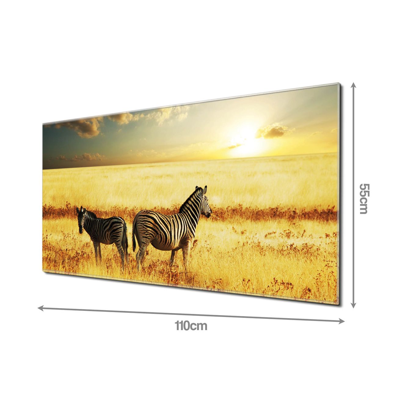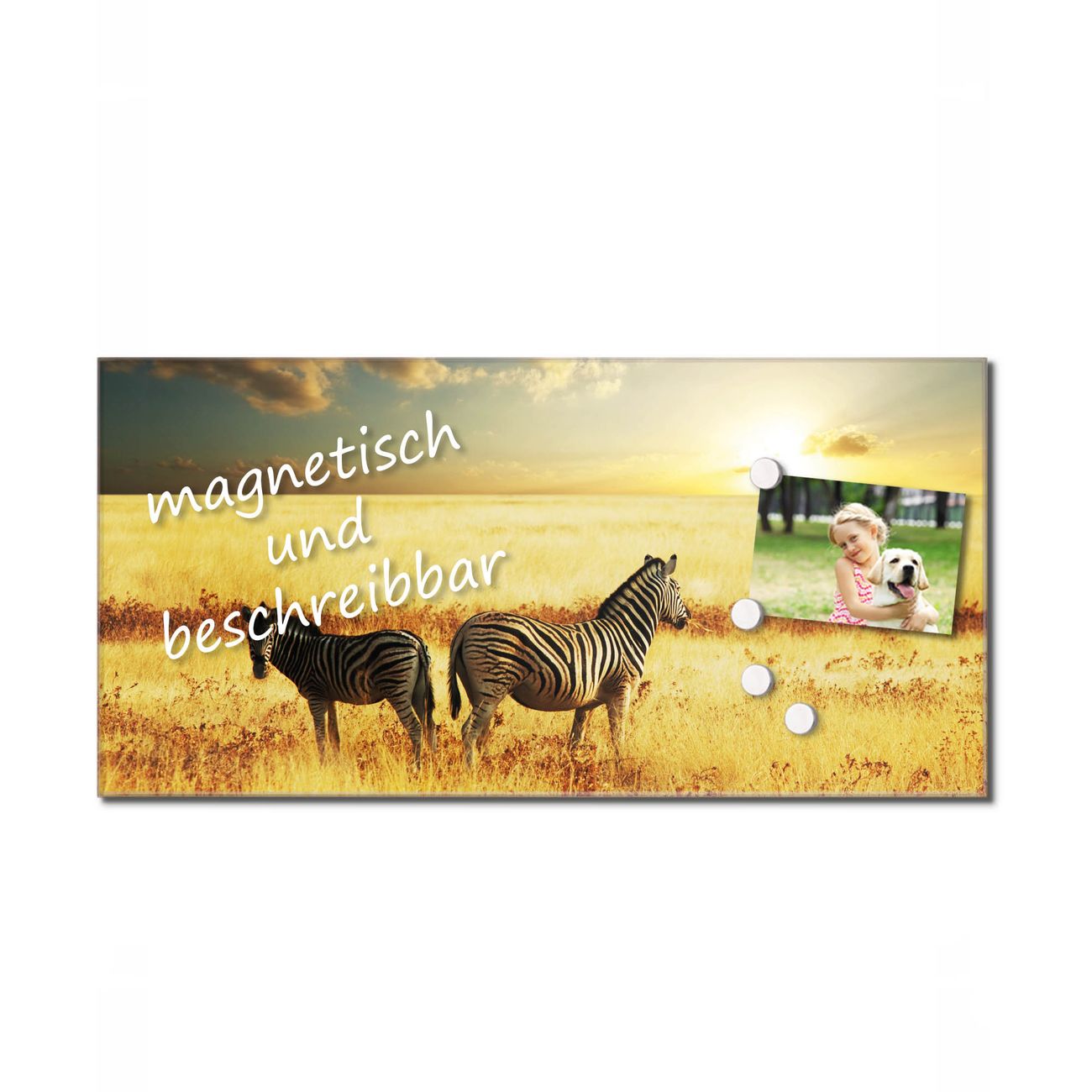 Material: 4mm Sicherheitsglas mit Metallrückwand Eigenschaften: beschreibbar, magnetisch, kratzfest Maße: 110x55x0,6cm, 9,08kg schwer Motiv Nummer 12756 Zwei Zebras Zubehör: inklusive 4 Neodym-Magnete