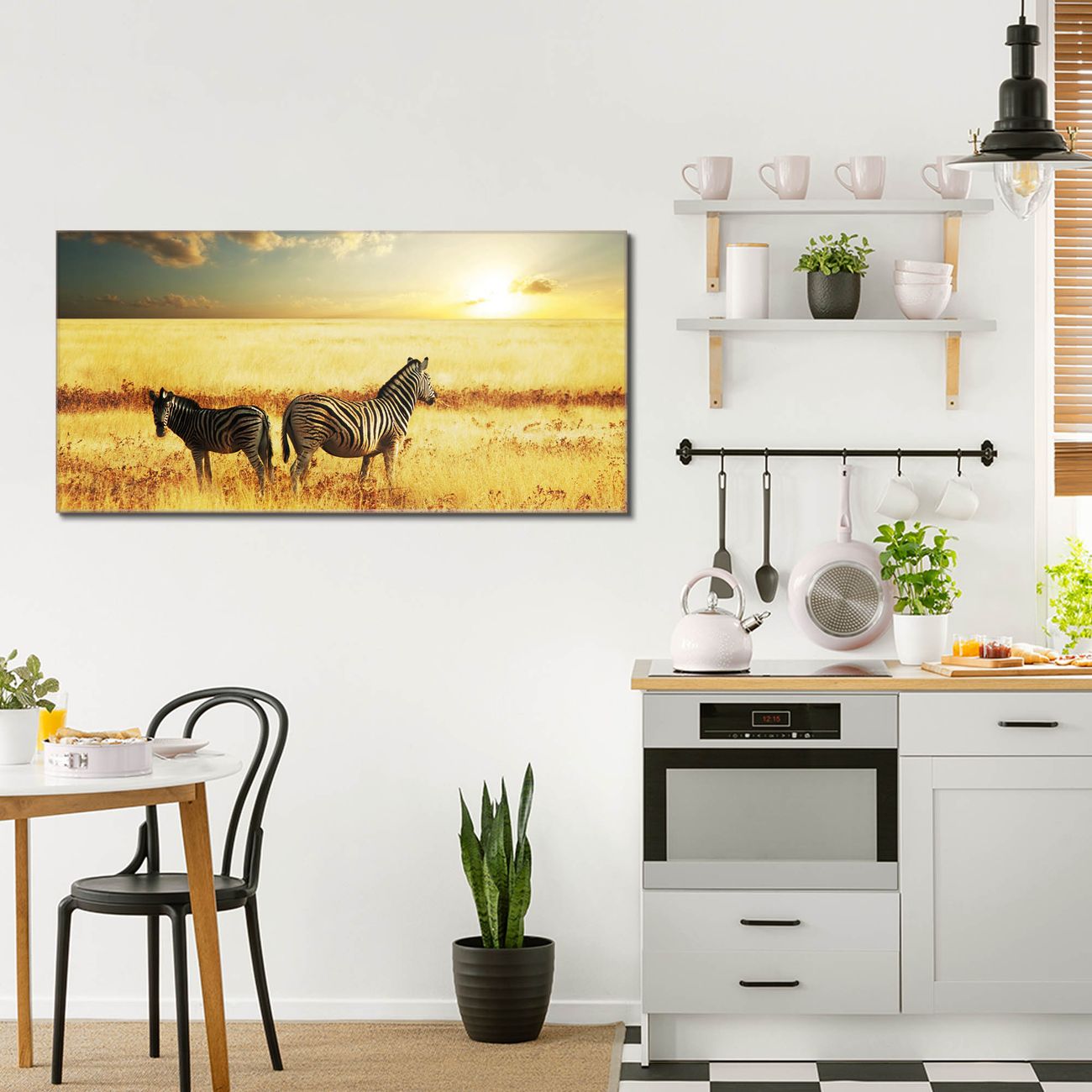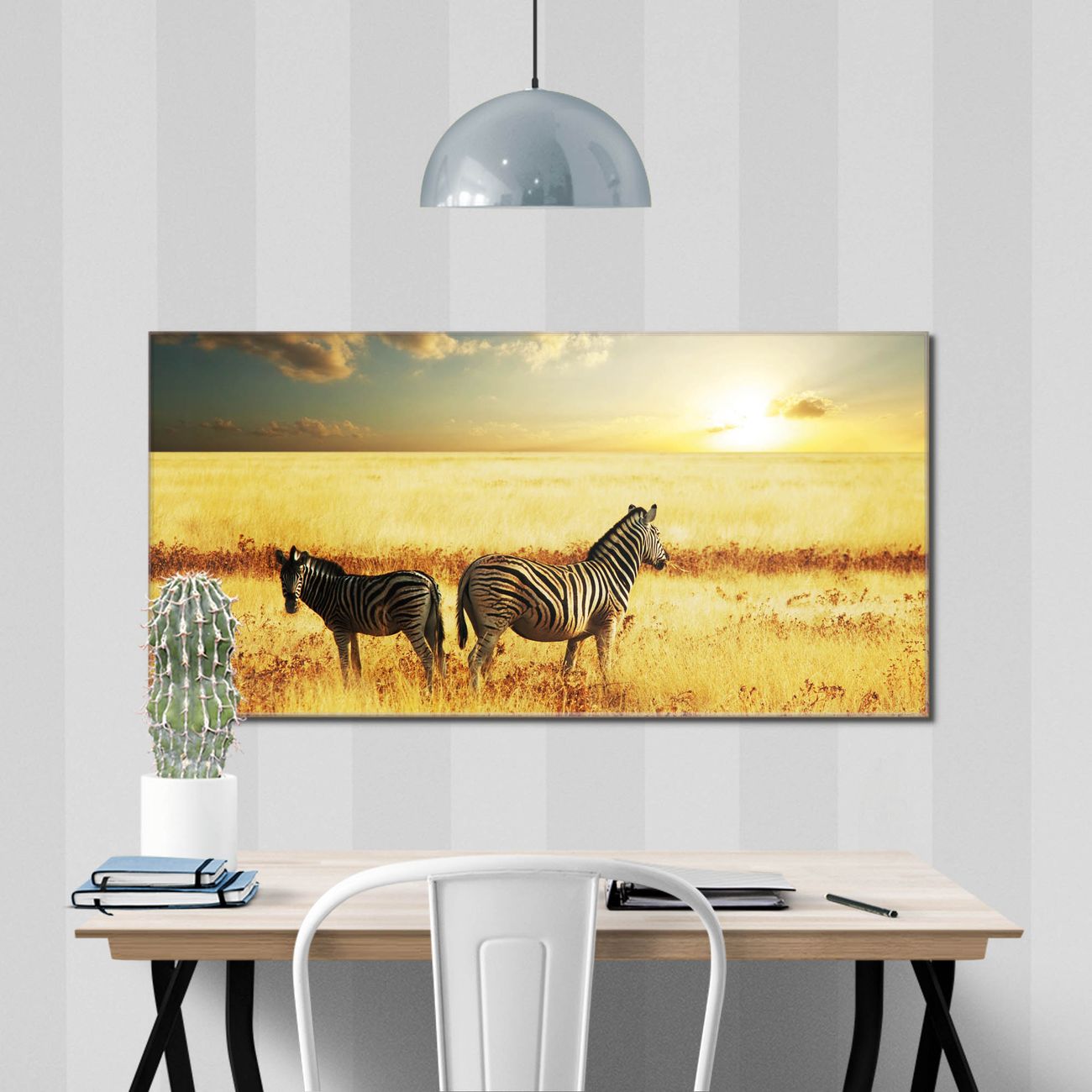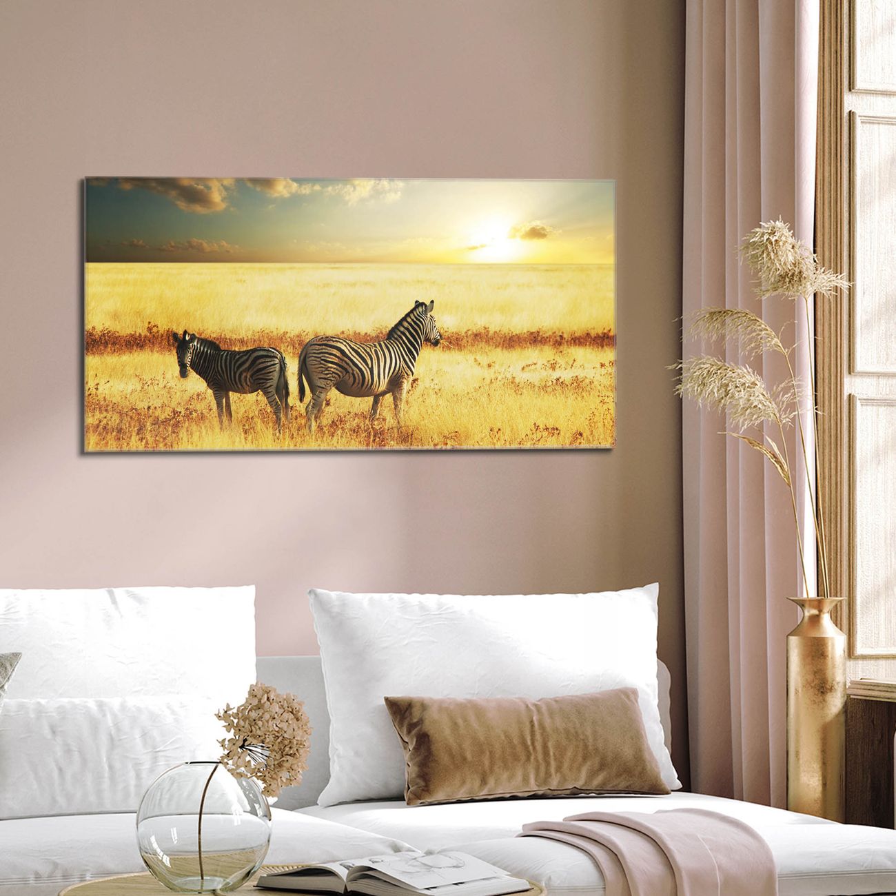 Material: 4mm Sicherheitsglas mit Metallrückwand Eigenschaften: beschreibbar, magnetisch, kratzfest Maße: 110x55x0,6cm, 9,08kg schwer Motiv Nummer 12756 Zwei Zebras Zubehör: inklusive 4 Neodym-Magnete