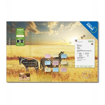Material: 4mm Sicherheitsglas mit Metallrückwand Eigenschaften: beschreibbar, magnetisch, kratzfest Maße: 120x80x0,6cm, 14,40kg schwer Motiv Nummer 12756 Zwei Zebras Zubehör: inklusive 4 Neodym-Magnete