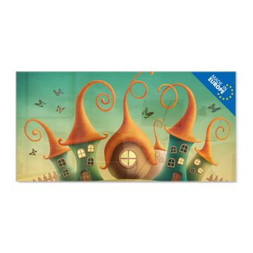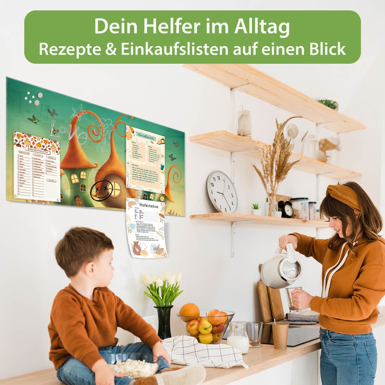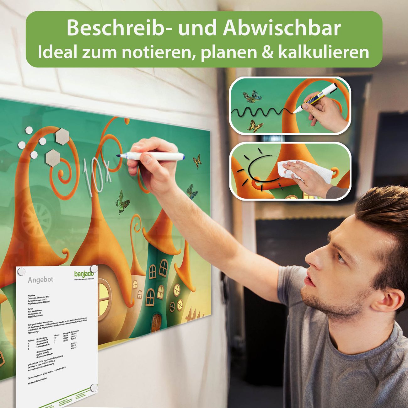 Material: 4mm Sicherheitsglas mit Metallrückwand Eigenschaften: beschreibbar, magnetisch, kratzfest Maße: 100x50x0,6cm, 7,50kg schwer Motiv Nummer 11103 Zwergenhausen Zubehör: inklusive 4 Neodym-Magnete