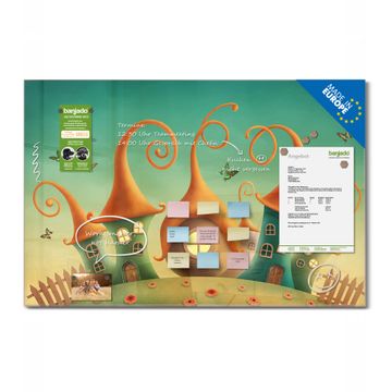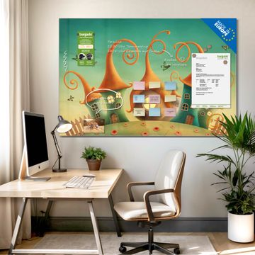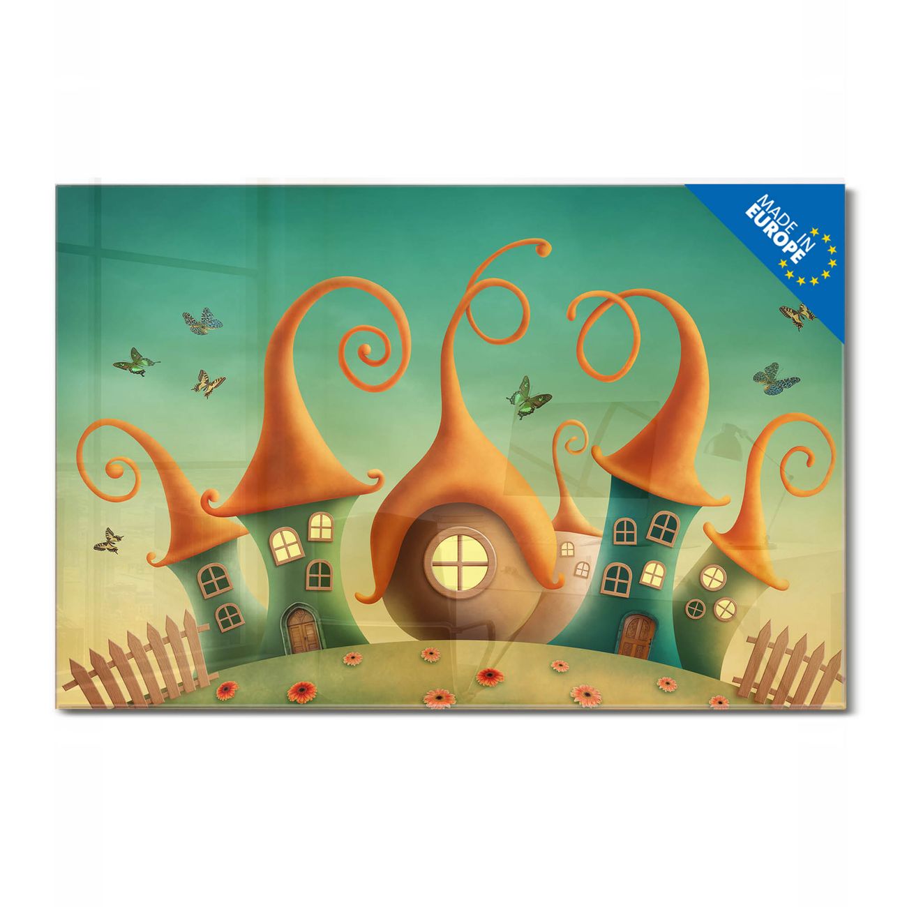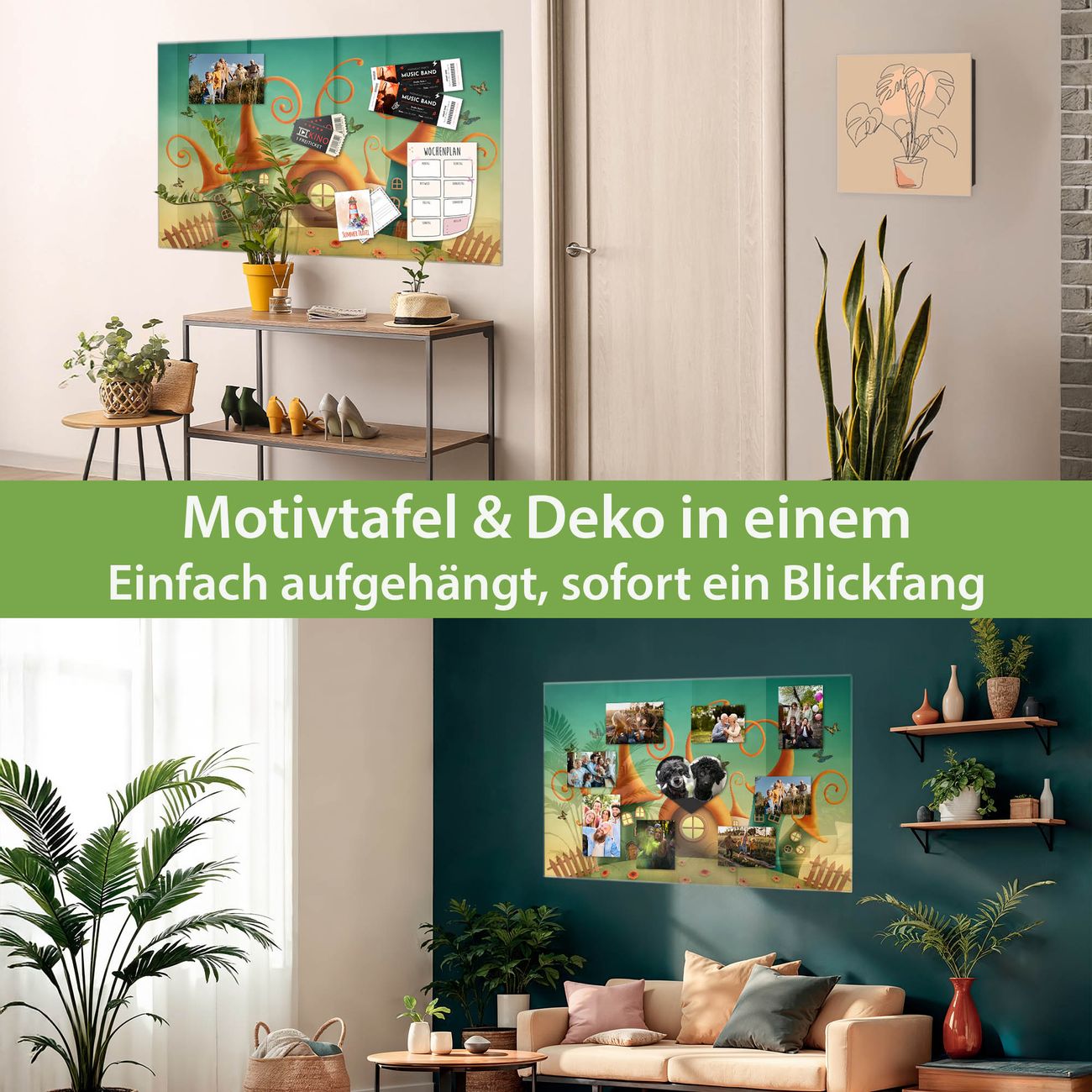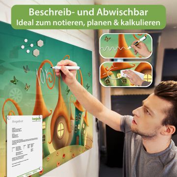 Material: 4mm Sicherheitsglas mit Metallrückwand Eigenschaften: beschreibbar, magnetisch, kratzfest Maße: 120x80x0,6cm, 14,40kg schwer Motiv Nummer 11103 Zwergenhausen Zubehör: inklusive 4 Neodym-Magnete