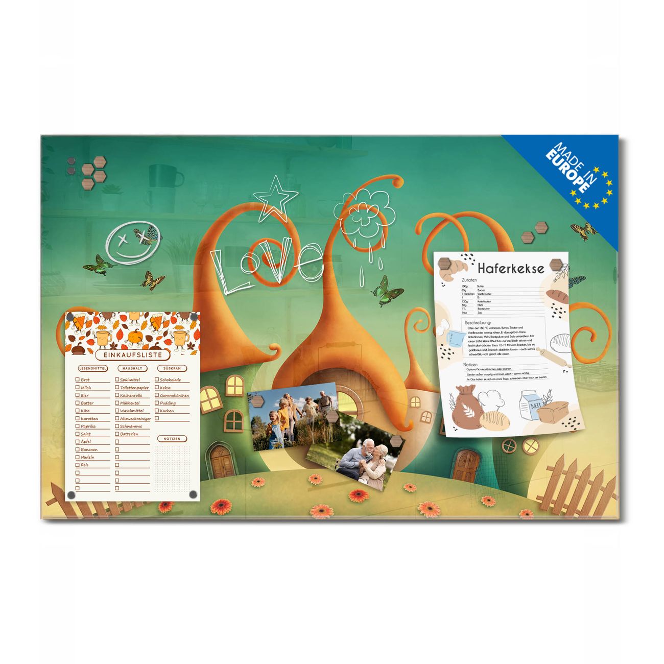 Material: 4mm Sicherheitsglas mit Metallrückwand Eigenschaften: beschreibbar, magnetisch, kratzfest Maße: 75x50x0,6cm, 5,63kg schwer Motiv Nummer 11103 Zwergenhausen Zubehör: inklusive 4 Neodym-Magnete
