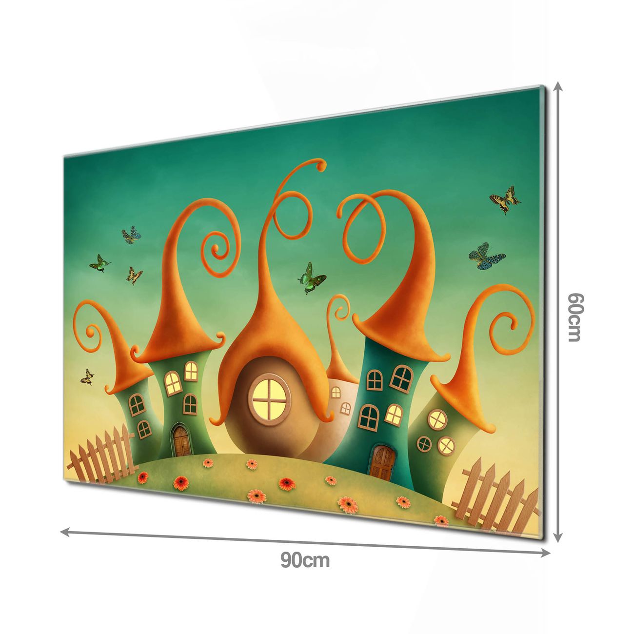 Material: 4mm Sicherheitsglas mit Metallrückwand Eigenschaften: beschreibbar, magnetisch, kratzfest Maße: 90x60x0,6cm, 8,10kg schwer Motiv Nummer 11103 Zwergenhausen Zubehör: inklusive 4 Neodym-Magnete