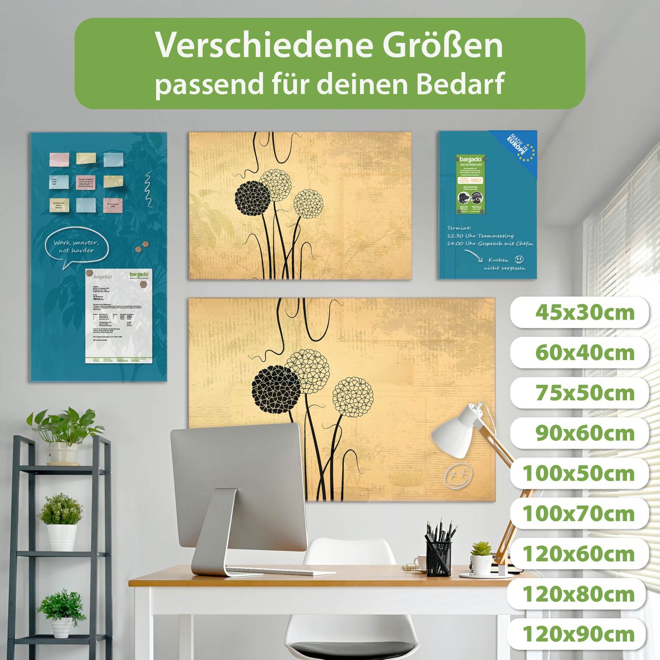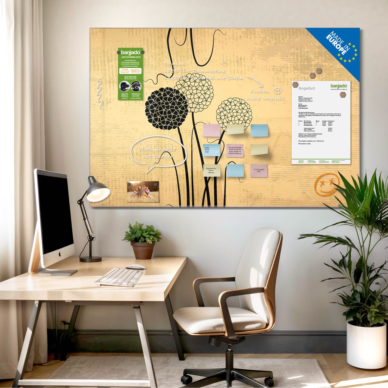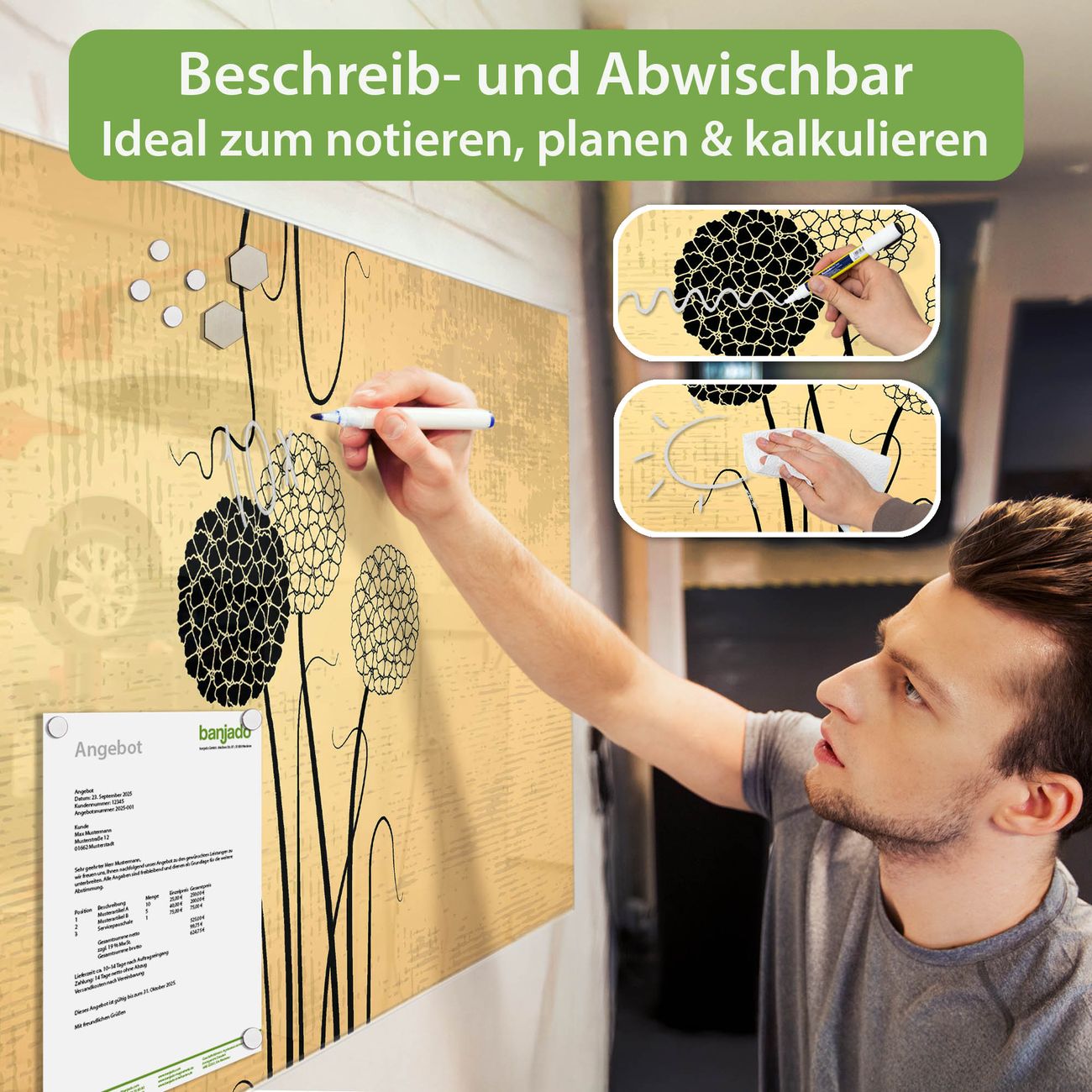Jede Glas Magnettafel wird in unserer Werkstatt von Hand gefertigt und sorgfältig geprüft. So erhalten Sie ein echtes Qualitätsprodukt, das Funktion und Ästhetik perfekt vereint.?? Warum banjado?
