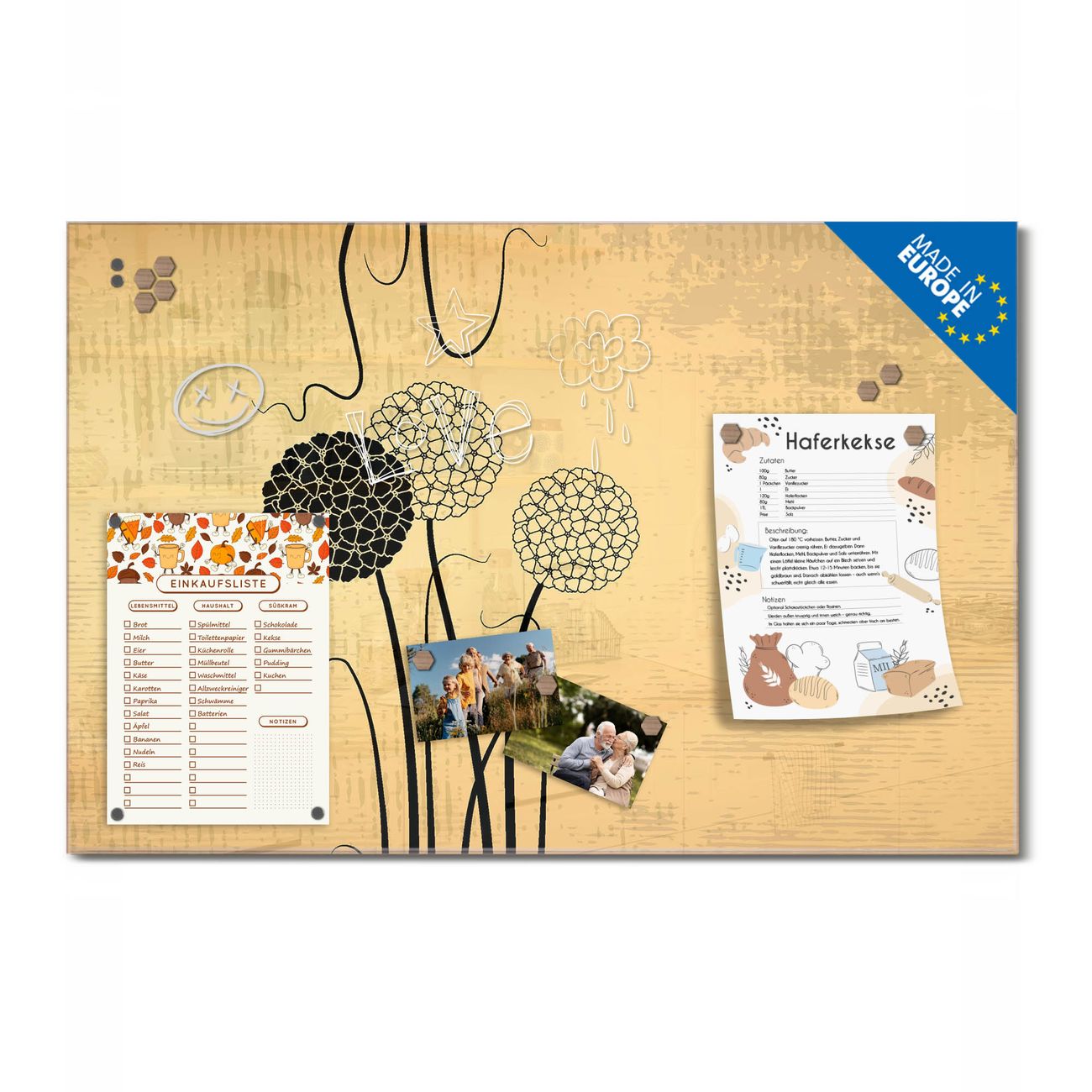 Material: 4mm Sicherheitsglas mit Metallrückwand Eigenschaften: beschreibbar, magnetisch, kratzfest Maße: 75x50x0,6cm, 5,63kg schwer Motiv Nummer 12170 Zwiebel Vintage Zubehör: inklusive 4 Neodym-Magnete