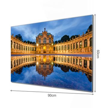 Material: 4mm Sicherheitsglas mit Metallrückwand Eigenschaften: beschreibbar, magnetisch, kratzfest Maße: 90x60x0,6cm, 8,10kg schwer Motiv Nummer 12421 Zwinger Dresden Zubehör: inklusive 4 Neodym-Magnete