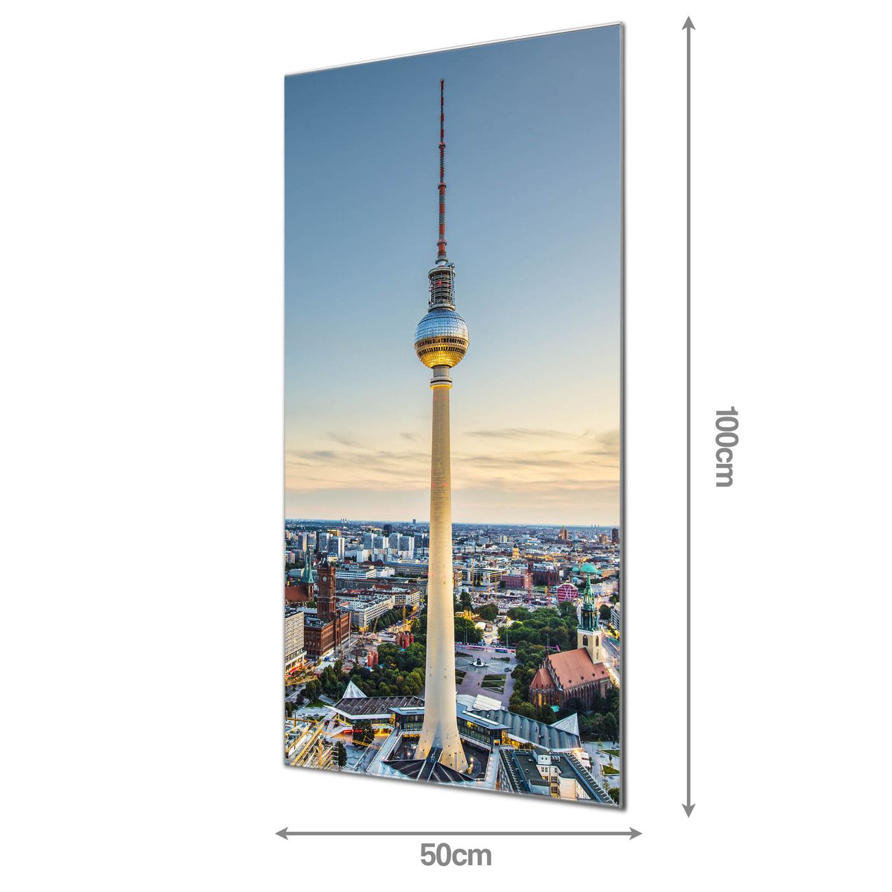 Material: 4mm Sicherheitsglas mit Metallrückwand Eigenschaften: beschreibbar, magnetisch, kratzfest Maße: 50x100x0,6cm, 7,50 kg schwer Motiv Nummer 12419 Alexanderplatz Zubehör: inklusive 4 Neodym-Magnete