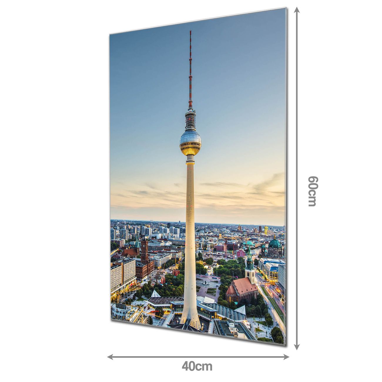 Material: 4mm Sicherheitsglas mit Metallrückwand Eigenschaften: beschreibbar, magnetisch, kratzfest Maße: 40x60x0,6cm, 3,60 kg schwer Motiv Nummer 12419 Alexanderplatz Zubehör: inklusive 4 Neodym-Magnete