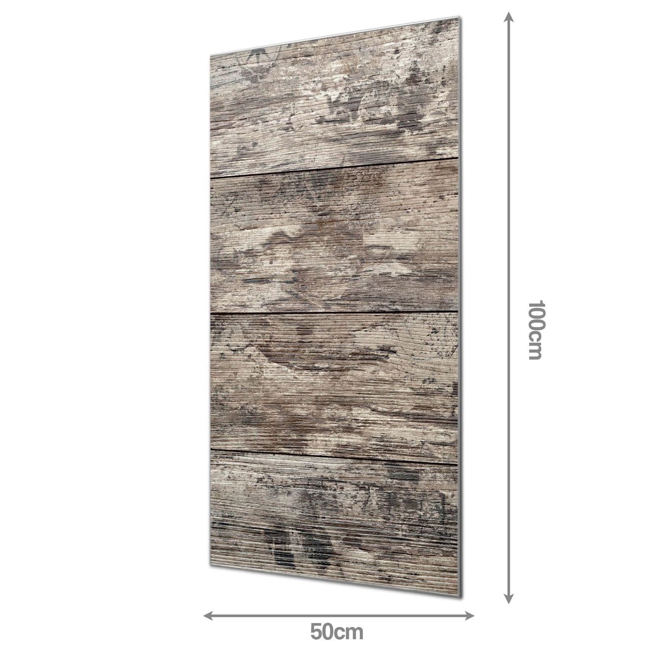 Material: 4mm Sicherheitsglas mit Metallrückwand Eigenschaften: beschreibbar, magnetisch, kratzfest Maße: 50x100x0,6cm, 7,50 kg schwer Motiv Nummer 11491 Alte Planken Zubehör: inklusive 4 Neodym-Magnete