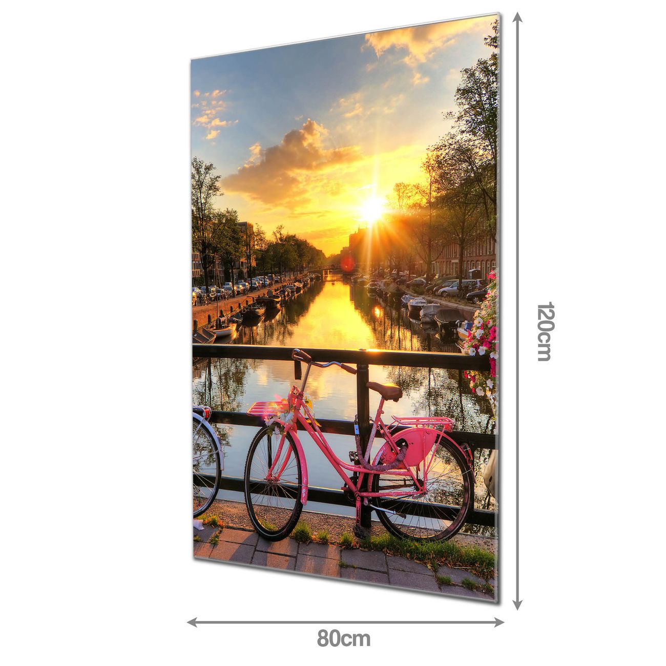 Material: 4mm Sicherheitsglas mit Metallrückwand Eigenschaften: beschreibbar, magnetisch, kratzfest Maße: 80x120x0,6cm, 14,40 kg schwer Motiv Nummer 12683 Amsterdam Mit Rad Zubehör: inklusive 4 Neodym-Magnete