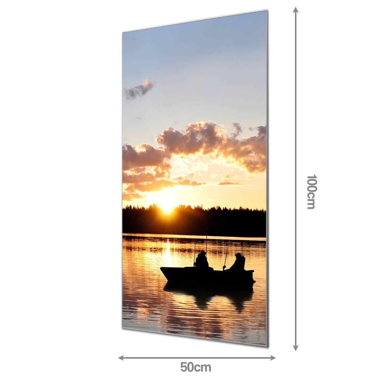 Material: 4mm Sicherheitsglas mit Metallrückwand Eigenschaften: beschreibbar, magnetisch, kratzfest Maße: 50x100x0,6cm, 7,50 kg schwer Motiv Nummer 10554 Angler Zubehör: inklusive 4 Neodym-Magnete