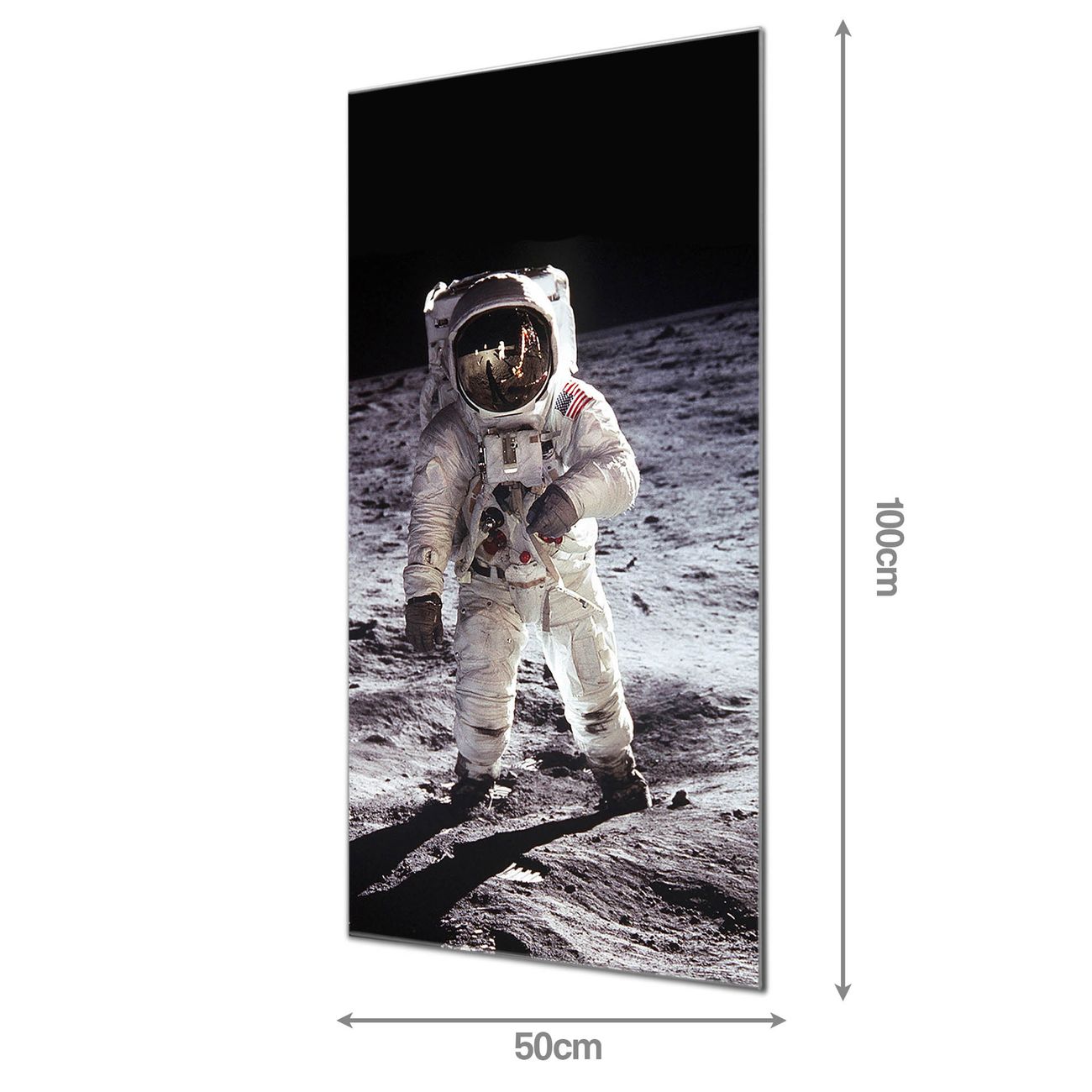 Material: 4mm Sicherheitsglas mit Metallrückwand Eigenschaften: beschreibbar, magnetisch, kratzfest Maße: 50x100x0,6cm, 7,50 kg schwer Motiv Nummer 10453 Astronaut Zubehör: inklusive 4 Neodym-Magnete
