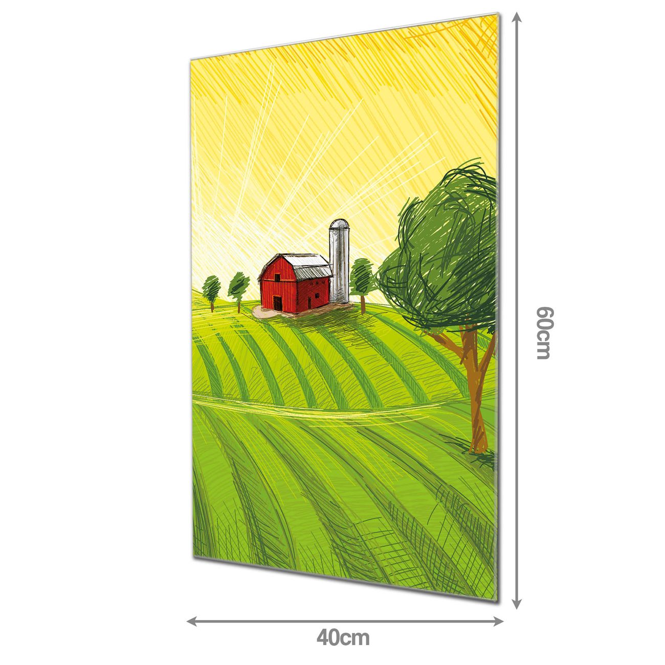 Material: 4mm Sicherheitsglas mit Metallrückwand Eigenschaften: beschreibbar, magnetisch, kratzfest Maße: 40x60x0,6cm, 3,60 kg schwer Motiv Nummer 11155 Auf dem Land Zubehör: inklusive 4 Neodym-Magnete