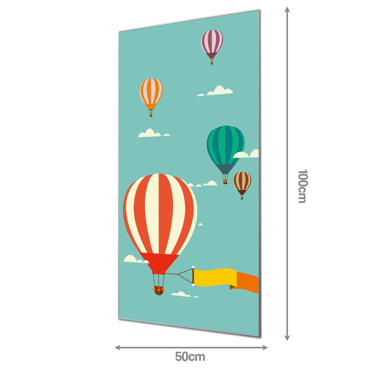 Material: 4mm Sicherheitsglas mit Metallrückwand Eigenschaften: beschreibbar, magnetisch, kratzfest Maße: 50x100x0,6cm, 7,50 kg schwer Motiv Nummer 11362 Vier Ballons Zubehör: inklusive 4 Neodym-Magnete