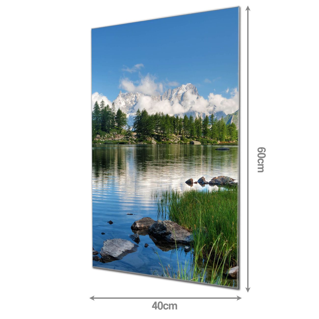 Material: 4mm Sicherheitsglas mit Metallrückwand Eigenschaften: beschreibbar, magnetisch, kratzfest Maße: 40x60x0,6cm, 3,60 kg schwer Motiv Nummer 12262 Gebirgssee Zubehör: inklusive 4 Neodym-Magnete