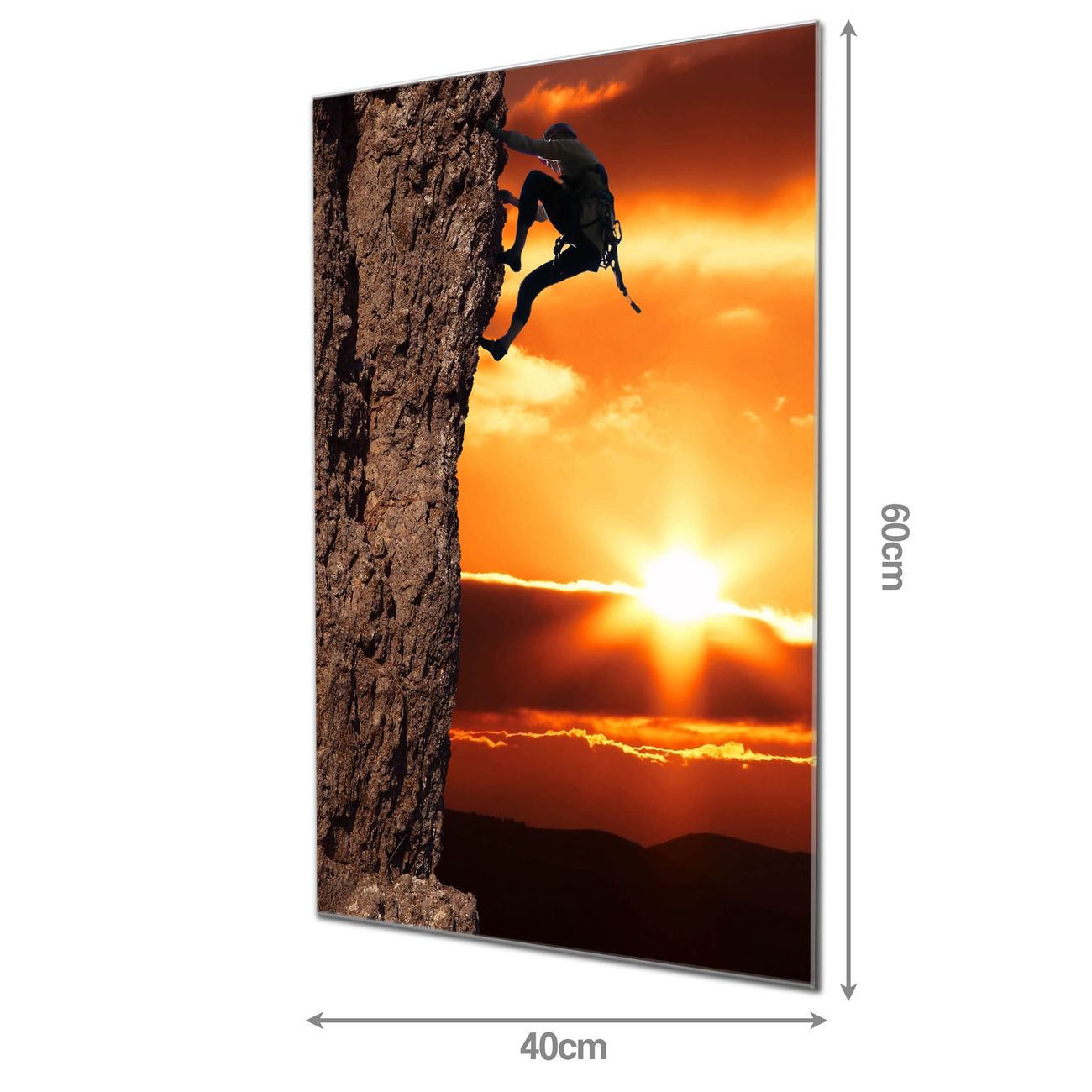 Material: 4mm Sicherheitsglas mit Metallrückwand Eigenschaften: beschreibbar, magnetisch, kratzfest Maße: 40x60x0,6cm, 3,60 kg schwer Motiv Nummer 10117 Bergsteiger Zubehör: inklusive 4 Neodym-Magnete