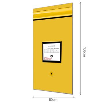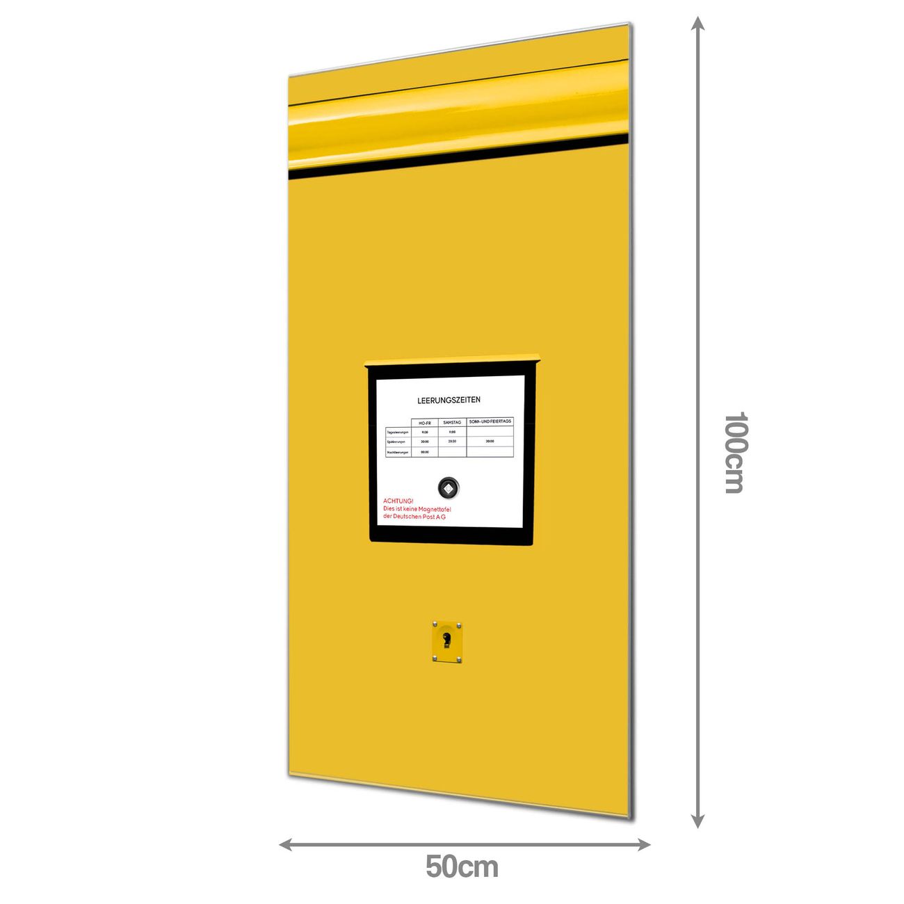 Material: 4mm Sicherheitsglas mit Metallrückwand Eigenschaften: beschreibbar, magnetisch, kratzfest Maße: 50x100x0,6cm, 7,50 kg schwer Motiv Nummer 10051 Briefkasten Gelb Zubehör: inklusive 4 Neodym-Magnete