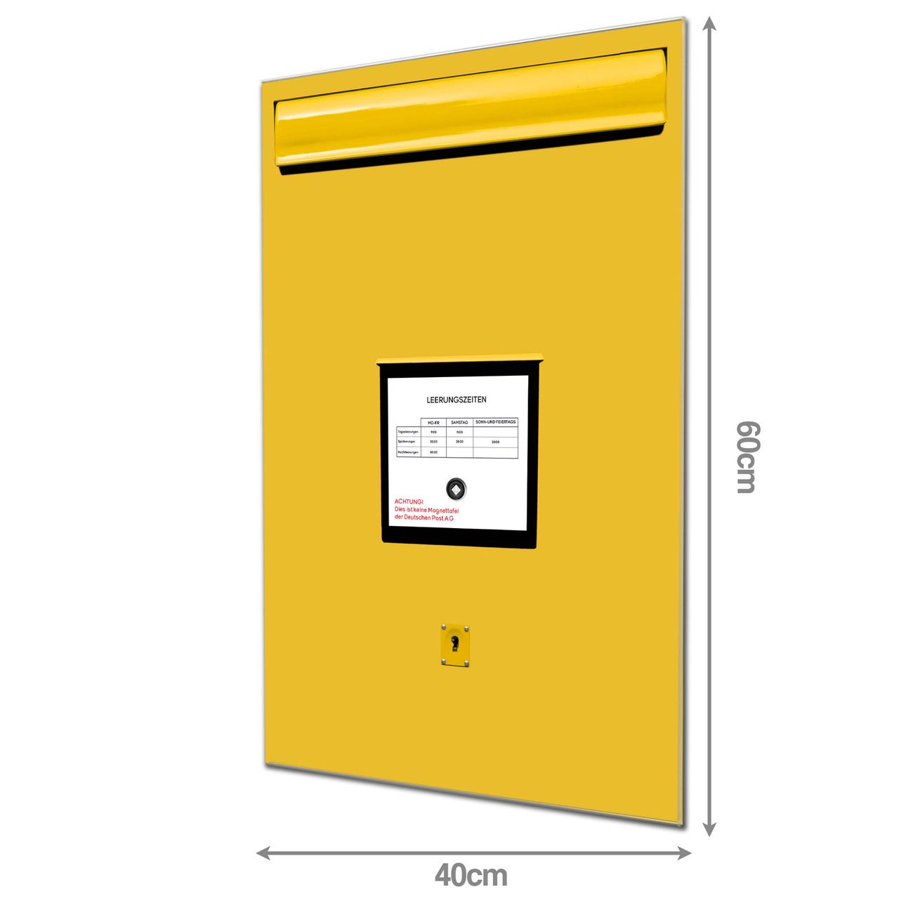 Material: 4mm Sicherheitsglas mit Metallrückwand Eigenschaften: beschreibbar, magnetisch, kratzfest Maße: 40x60x0,6cm, 3,60 kg schwer Motiv Nummer 10051 Briefkasten Gelb Zubehör: inklusive 4 Neodym-Magnete