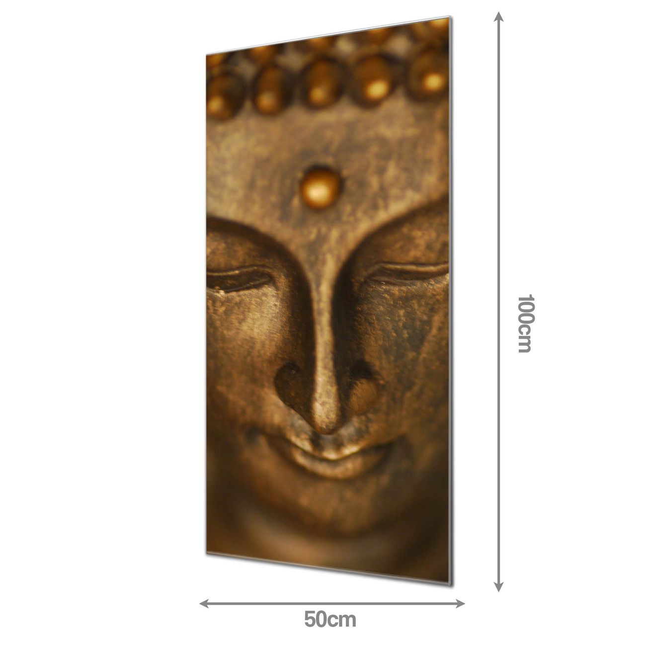 Material: 4mm Sicherheitsglas mit Metallrückwand Eigenschaften: beschreibbar, magnetisch, kratzfest Maße: 50x100x0,6cm, 7,50 kg schwer Motiv Nummer 10087 Buddha Gold Zubehör: inklusive 4 Neodym-Magnete